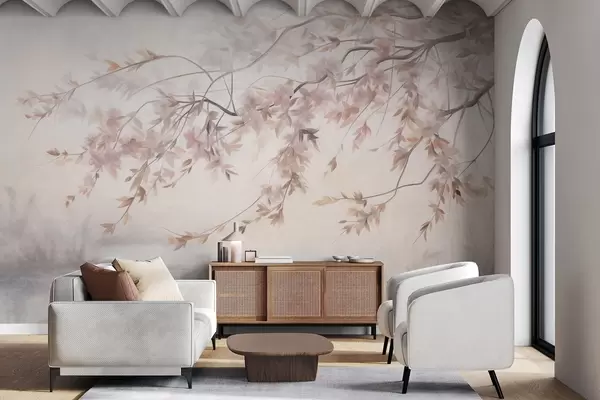Fotomurales Paisaje texturizado con rama de cerezo en flor, hojas rosadas y fondo suave y brumoso. Nr. w09743