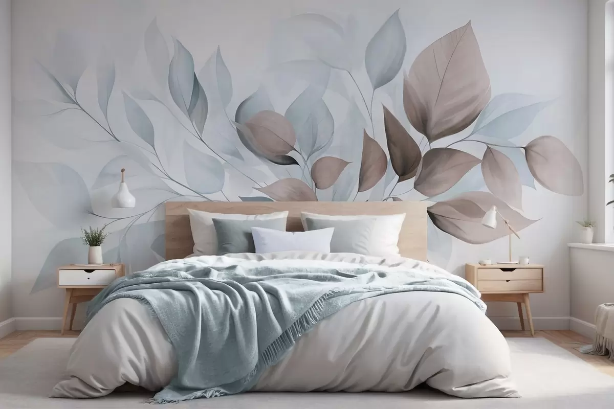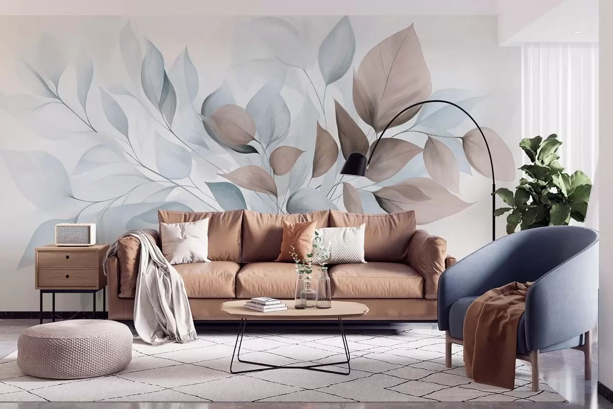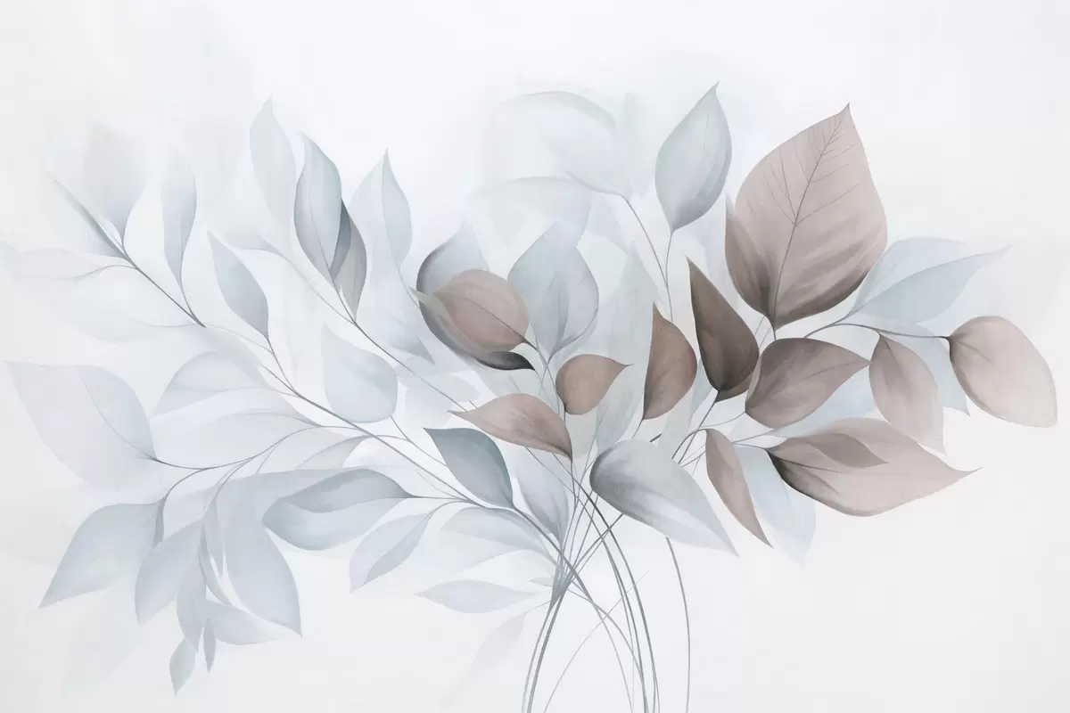 Fotomurales Hojas abstractas translúcidas en tonos azules, beige y marrones, arte texturizado. Nr. w09744v1