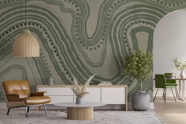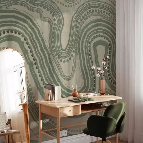 Fotomurales Líneas onduladas y puntos abstractos en verde y beige, arte moderno con textura. Nr. w09747