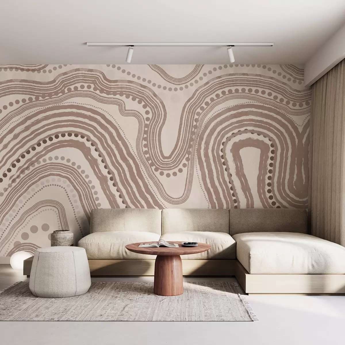 Fotomurales Líneas onduladas y puntos abstractos en marrón y beige, arte moderno con textura. Nr. w09747v1