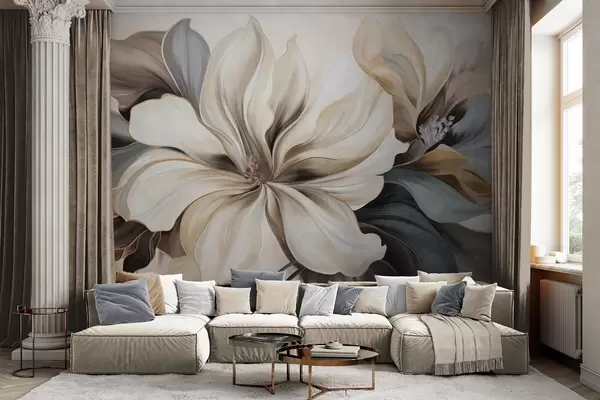 murales de pared Grandes flores cremosas de magnolia con hojas marrones y grises, iluminación suave, fondo abstracto. w09749