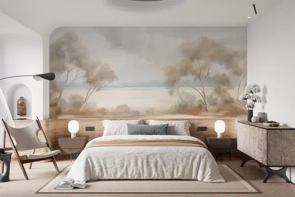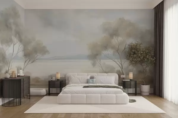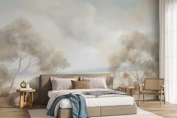 Fotomurales Un estilo de pintura con textura paisajística con árboles bajo un cielo nublado. Nr. w09753