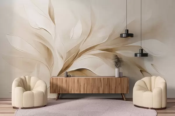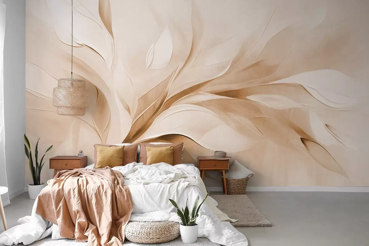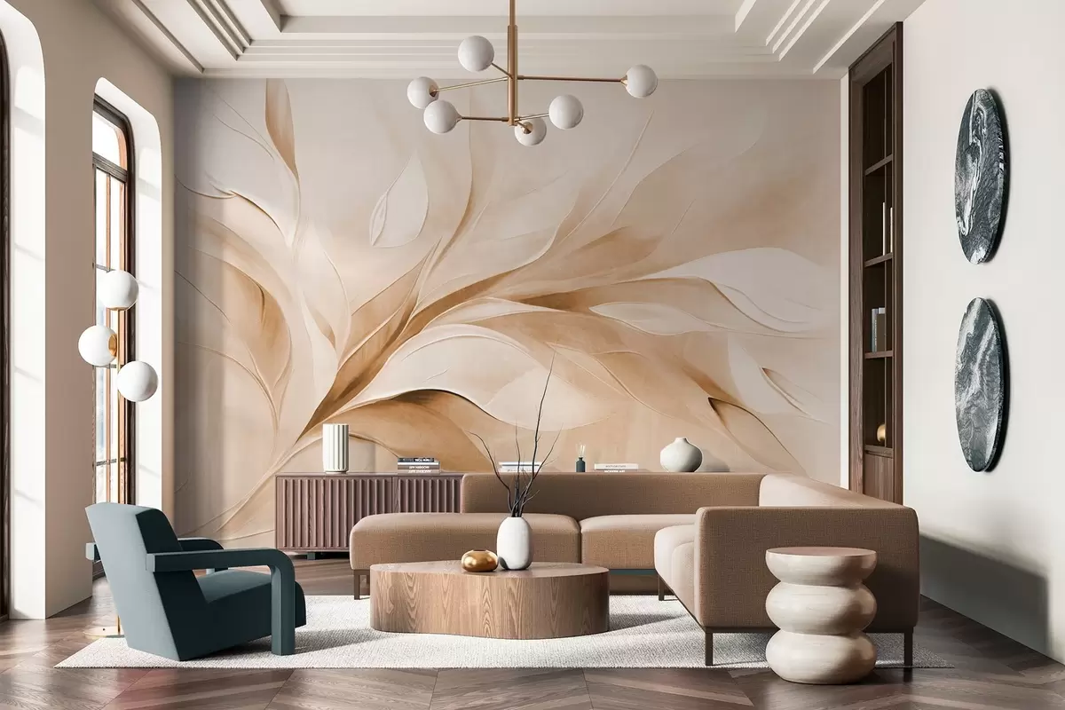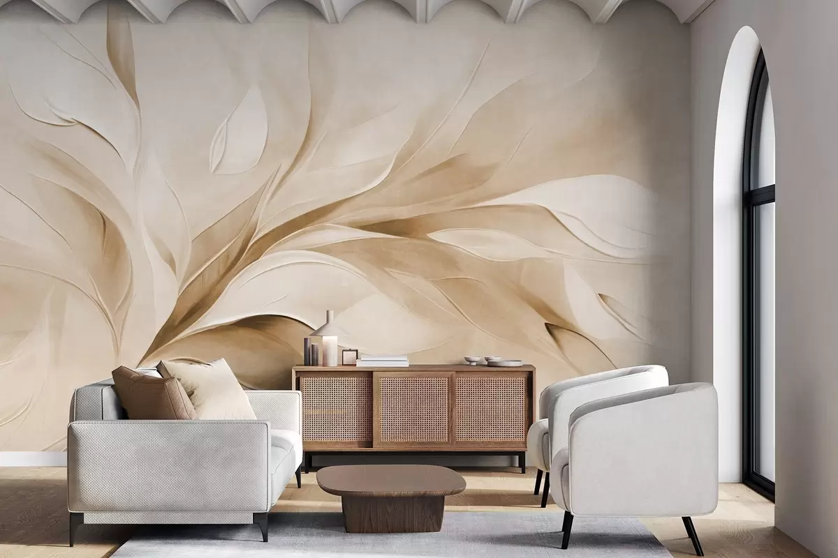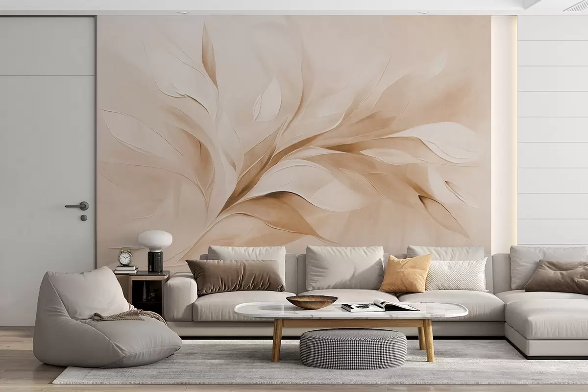 Fotomurales Estilo pictórico abstracto con textura de hojas fluidas en tonos beige y blanco. Nr. w09765v1