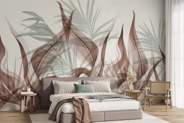 Fotomurales Hojas tropicales en tonos marrones y verdes sobre fondo blanco, estilo acuarela con textura. Nr. w09772