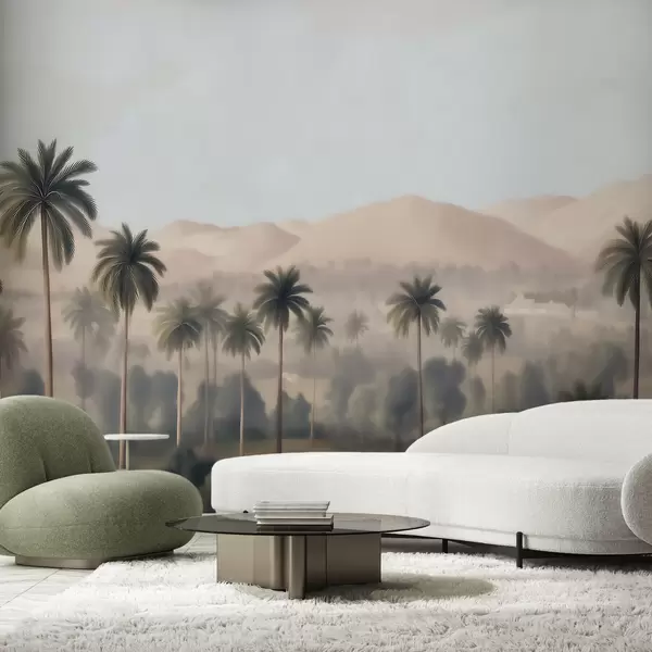 Fotomurales Paisaje tropical con palmeras y montañas, panorámica de estilo vintage en tonos beige y verdes Nr. w09798