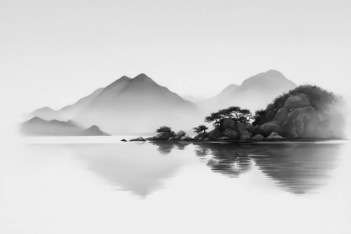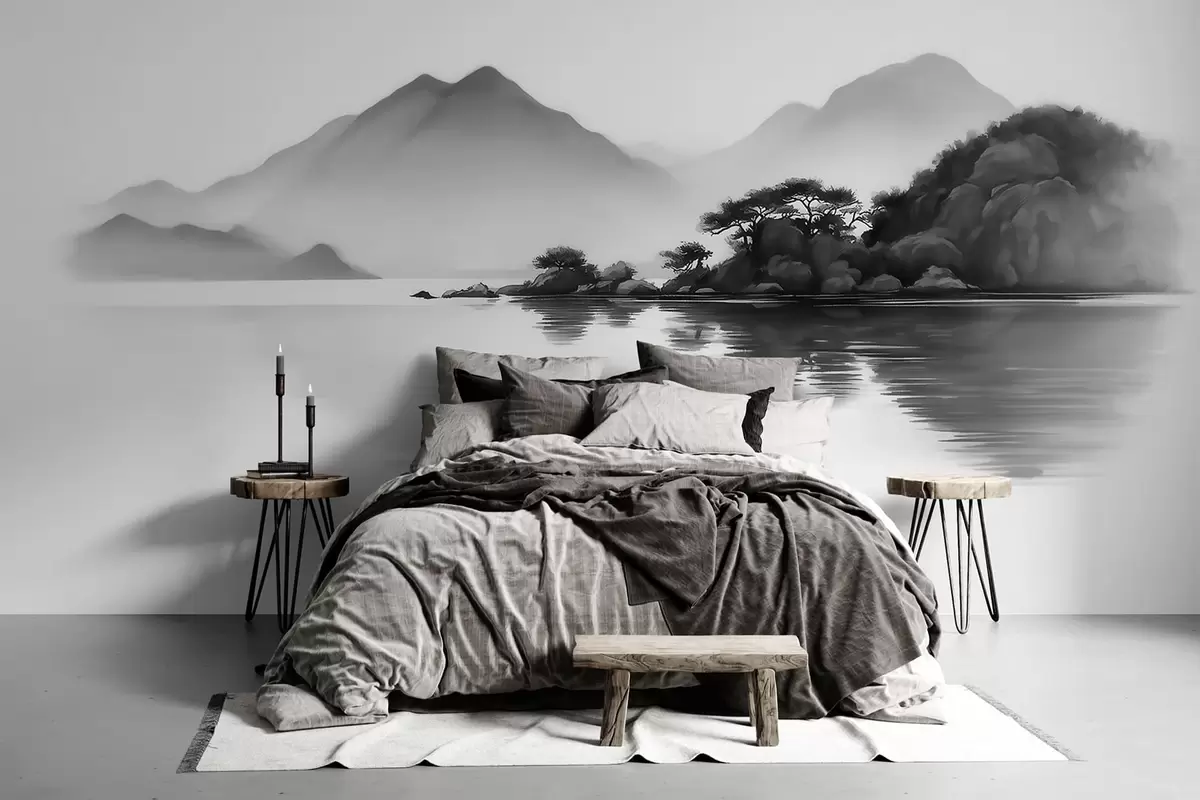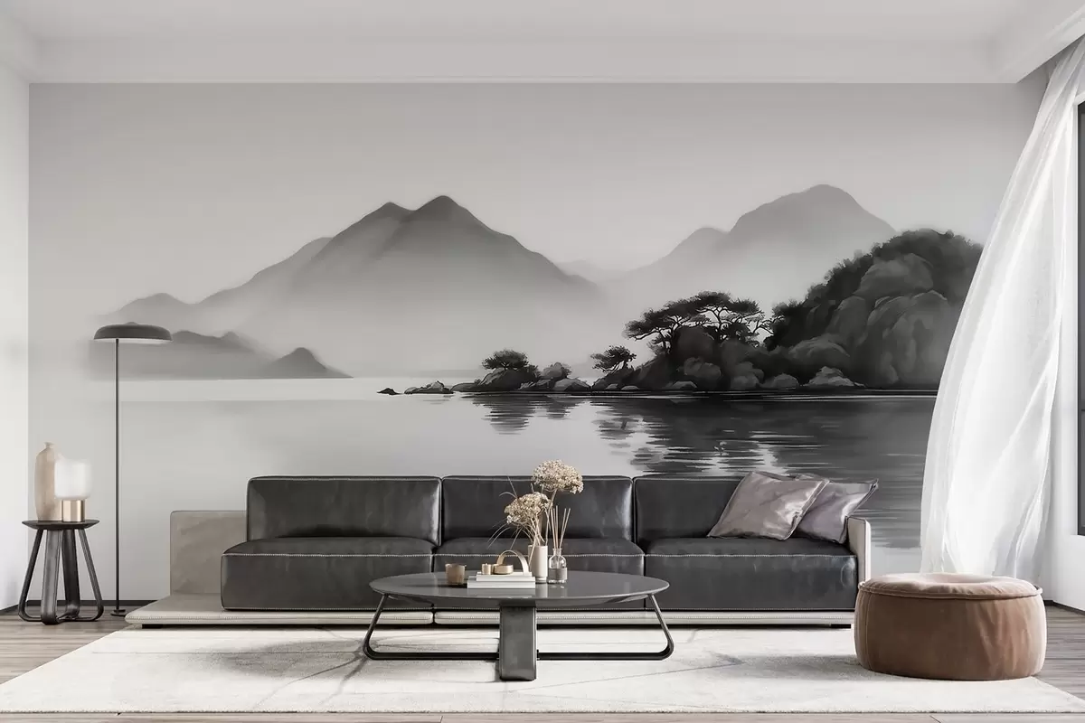 Fotomurales Paisaje en blanco y negro con montañas y un lago envueltos en una suave niebla Nr. w09803