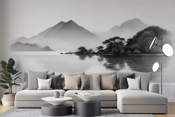 Fotomurales Paisaje en blanco y negro con montañas y un lago envueltos en una suave niebla Nr. w09803