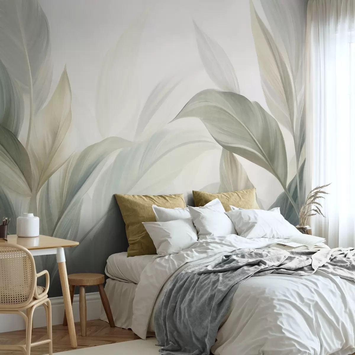 murales de pared Hojas tropicales grandes de color verde pálido con tonos suaves y pasteles, obra de arte con textura w09816