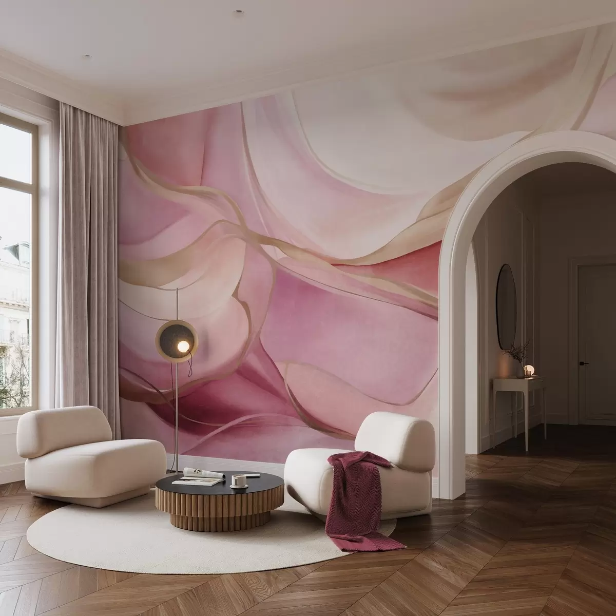 Fotomurales Formas fluidas con texturas abstractas en tonos rosa y beige, con delicadas líneas amarillas Nr. w09818