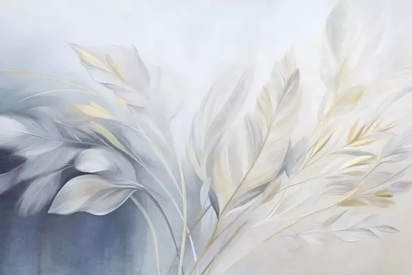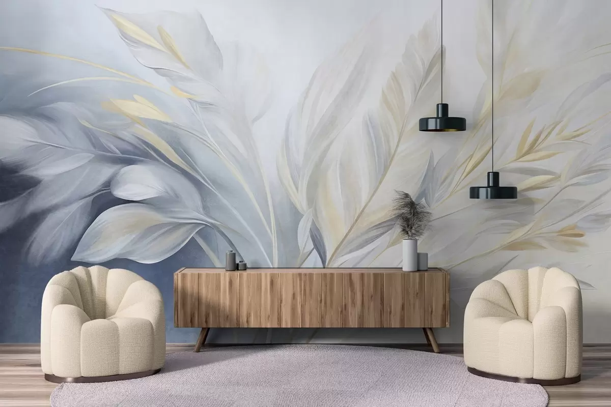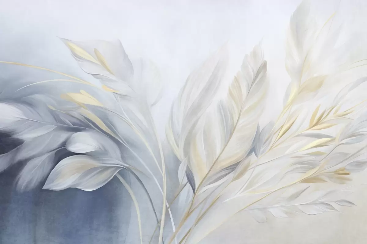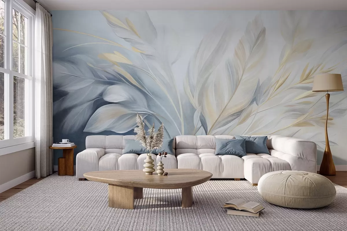 Fotomurales Plumas con textura y detalles en amarillo, sobre un fondo suave de azul claro y blanco Nr. w09826