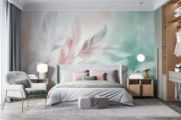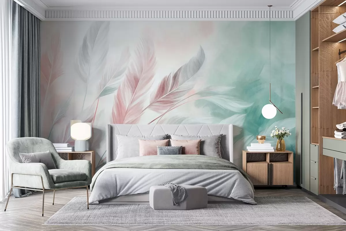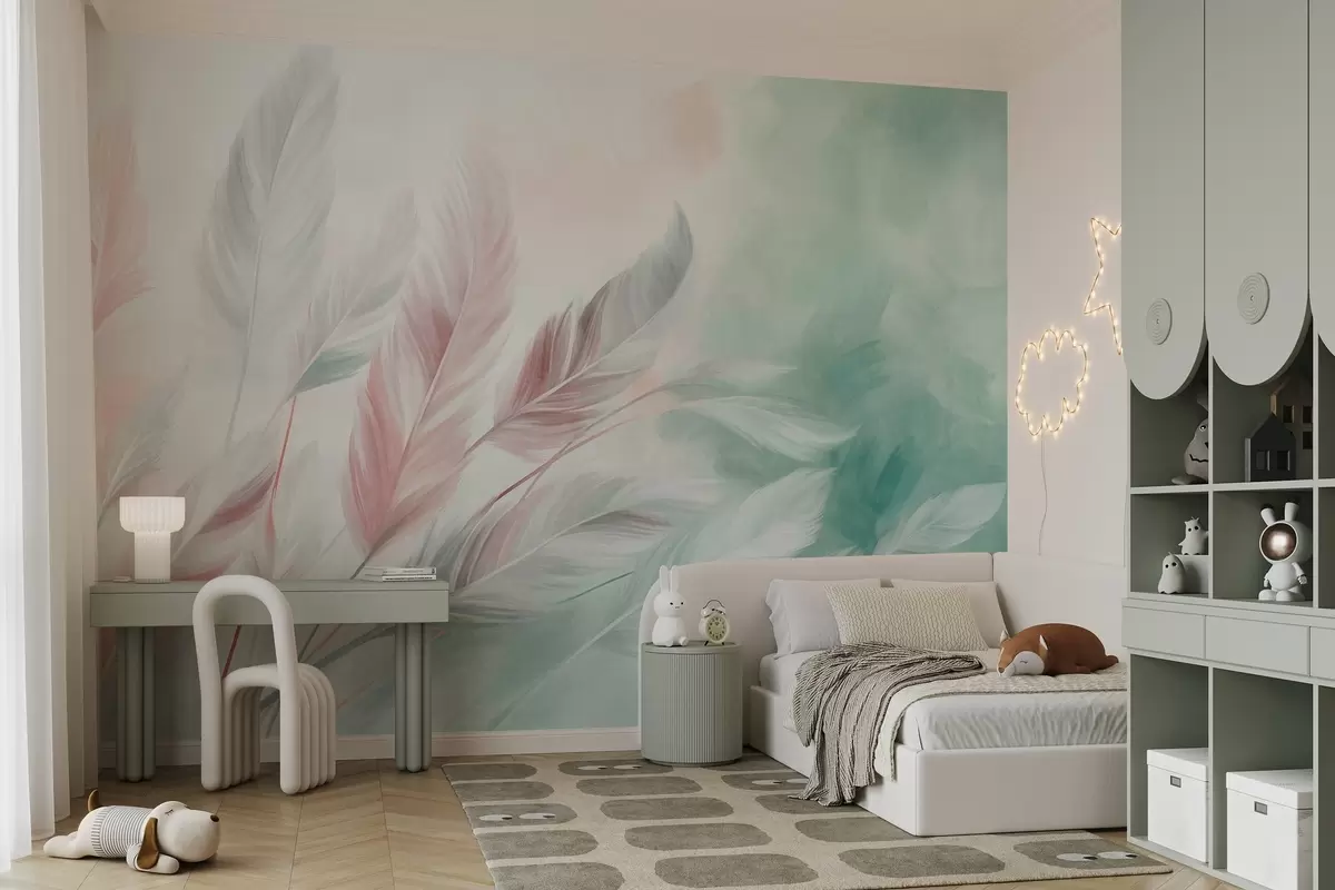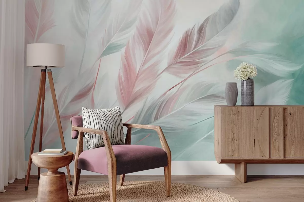 Fotomurales Plumas en tonos pastel con textura y bordes suaves y difuminados, sobre un fondo de estilo acuarela Nr. w09833v1
