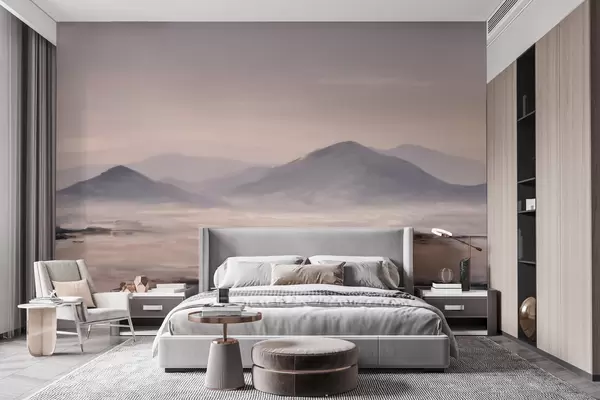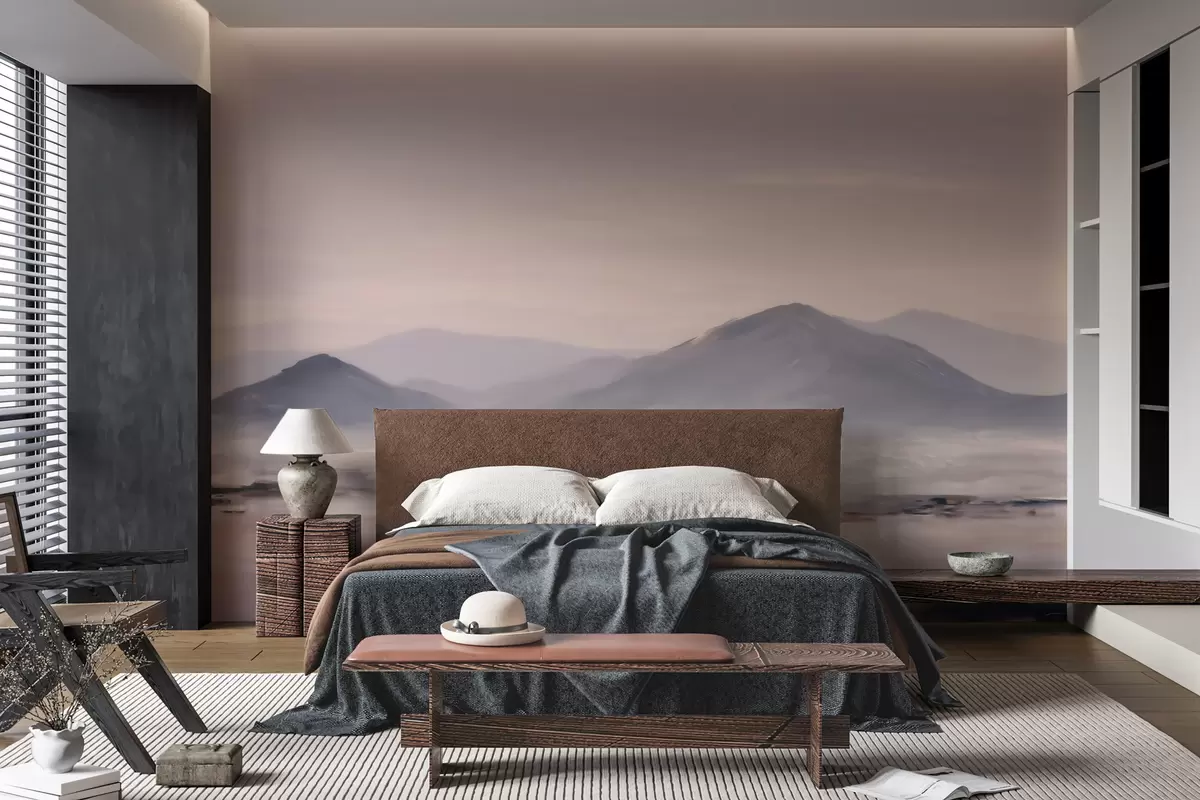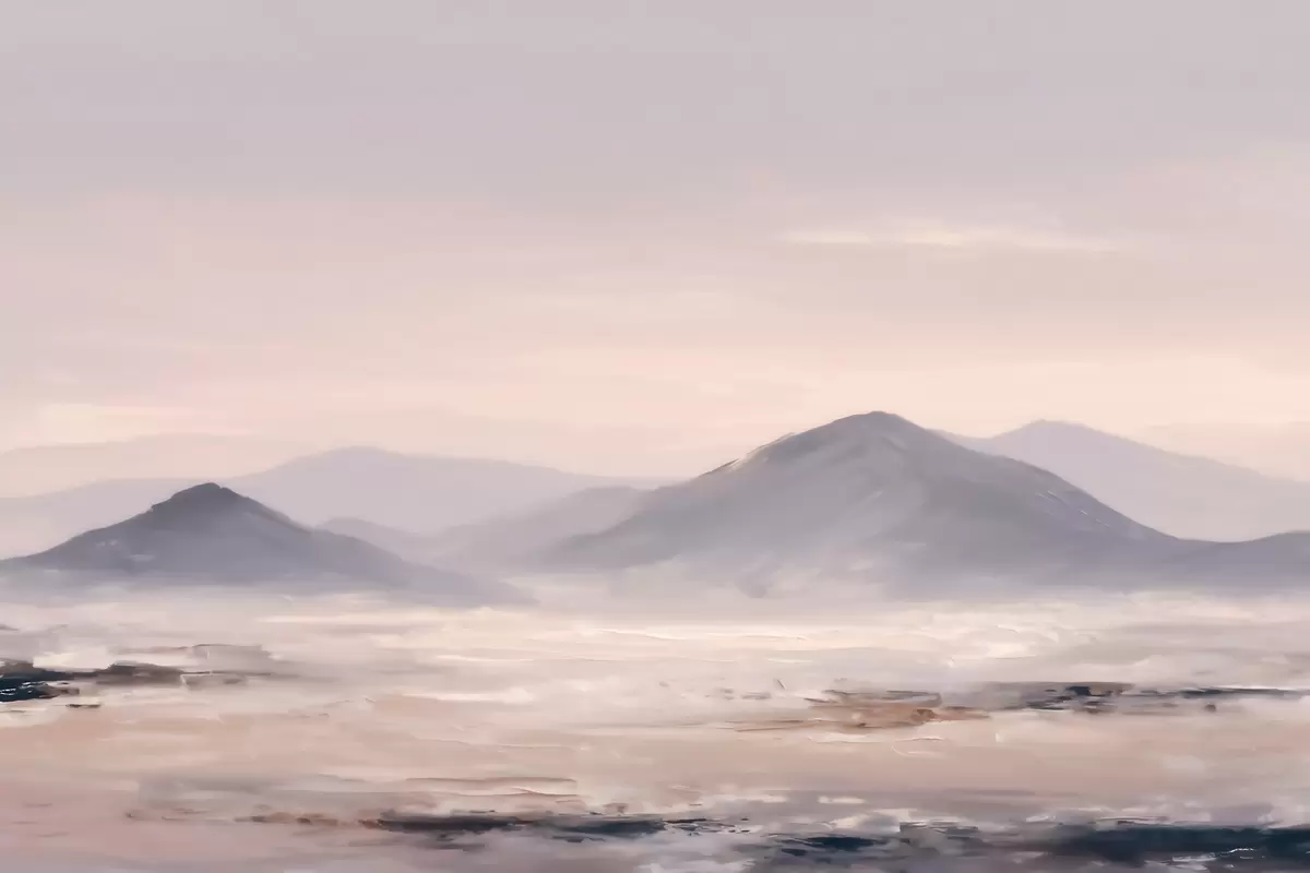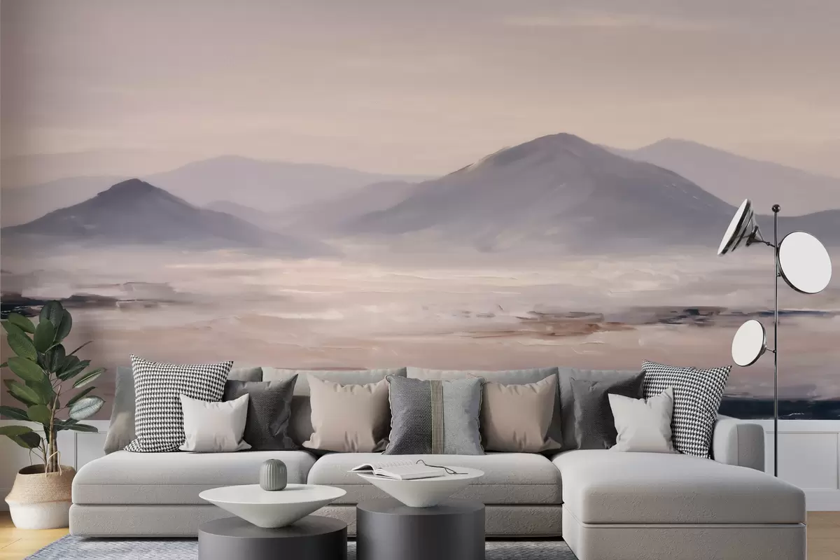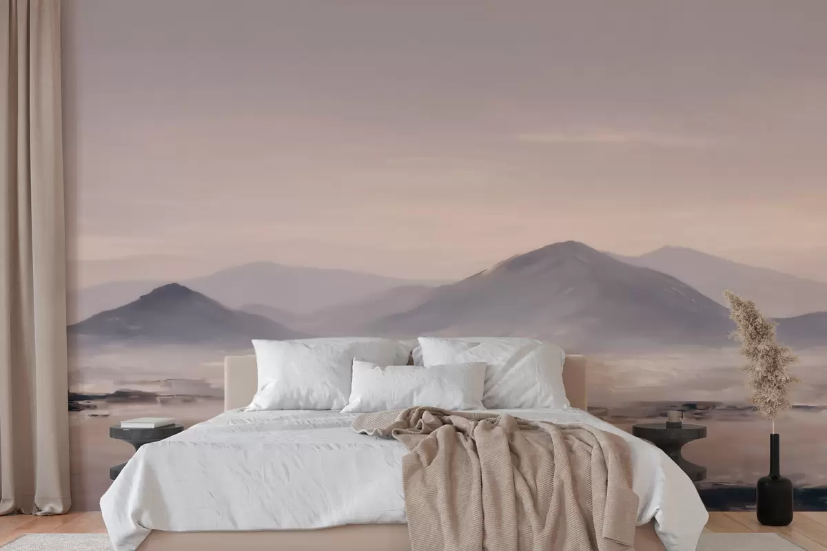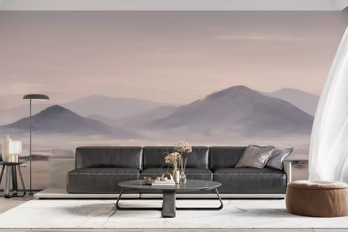 Fotomurales Un paisaje montañoso envuelto en niebla, con suaves transiciones de luz y aire, y un efecto similar al de una máscara Nr. w09844