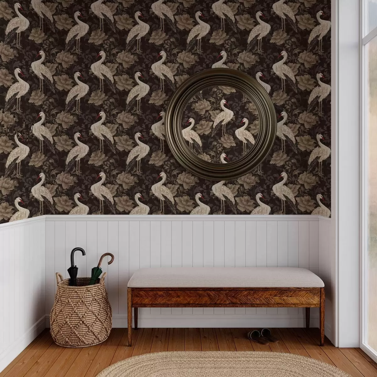Papel pintado Grullas entre grandes flores en una clásica paleta pastel Nr. a00108