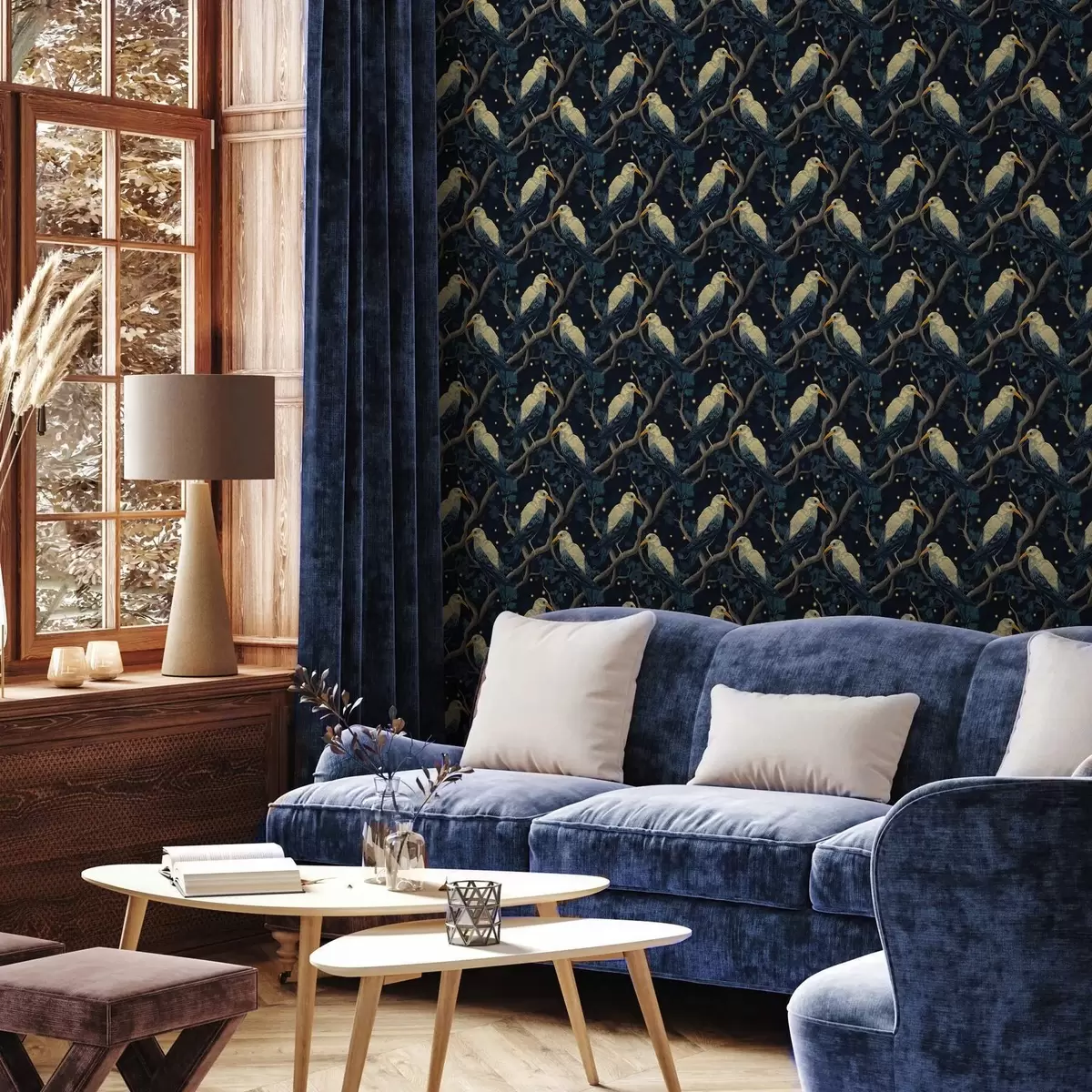 Papel pintado Pájaros nocturnos sobre ramas y estrellas sobre fondo azul oscuro Nr. a00109v1