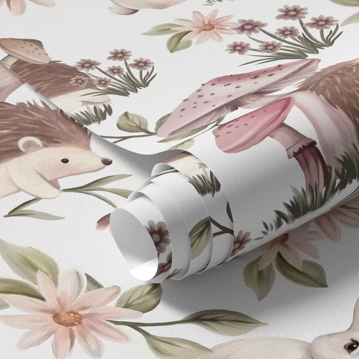 Papel pintado Erizos y conejos sobre fondo blanco con delicadas flores y setas Nr. a00111v2