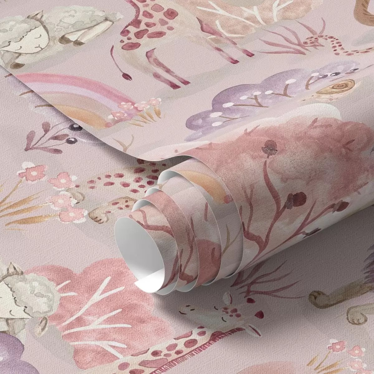 Papel pintado Cachorros de león, jirafas y arco iris en un bosque de colores pastel Nr. a00112