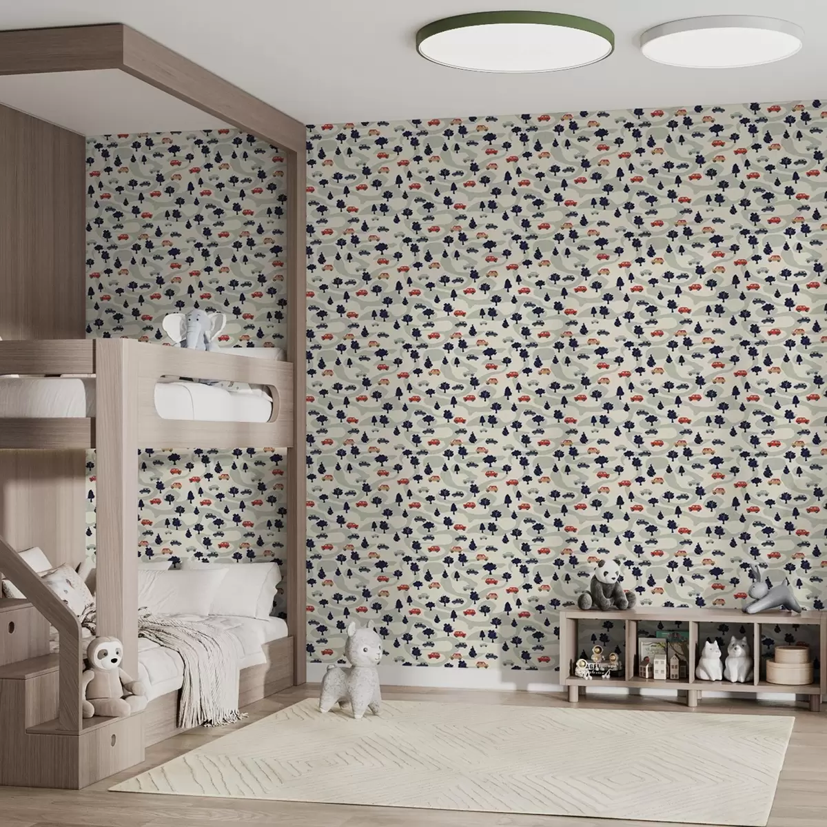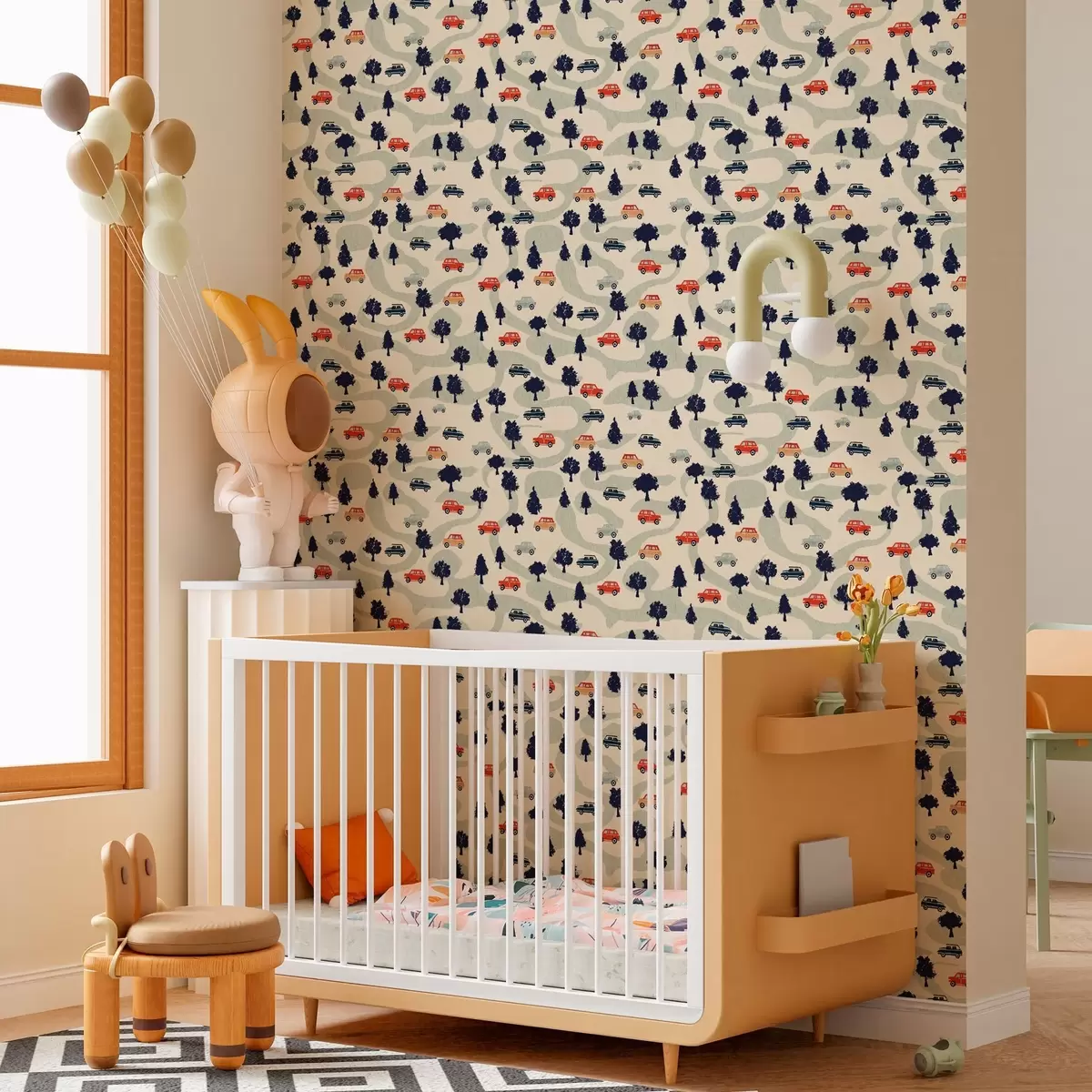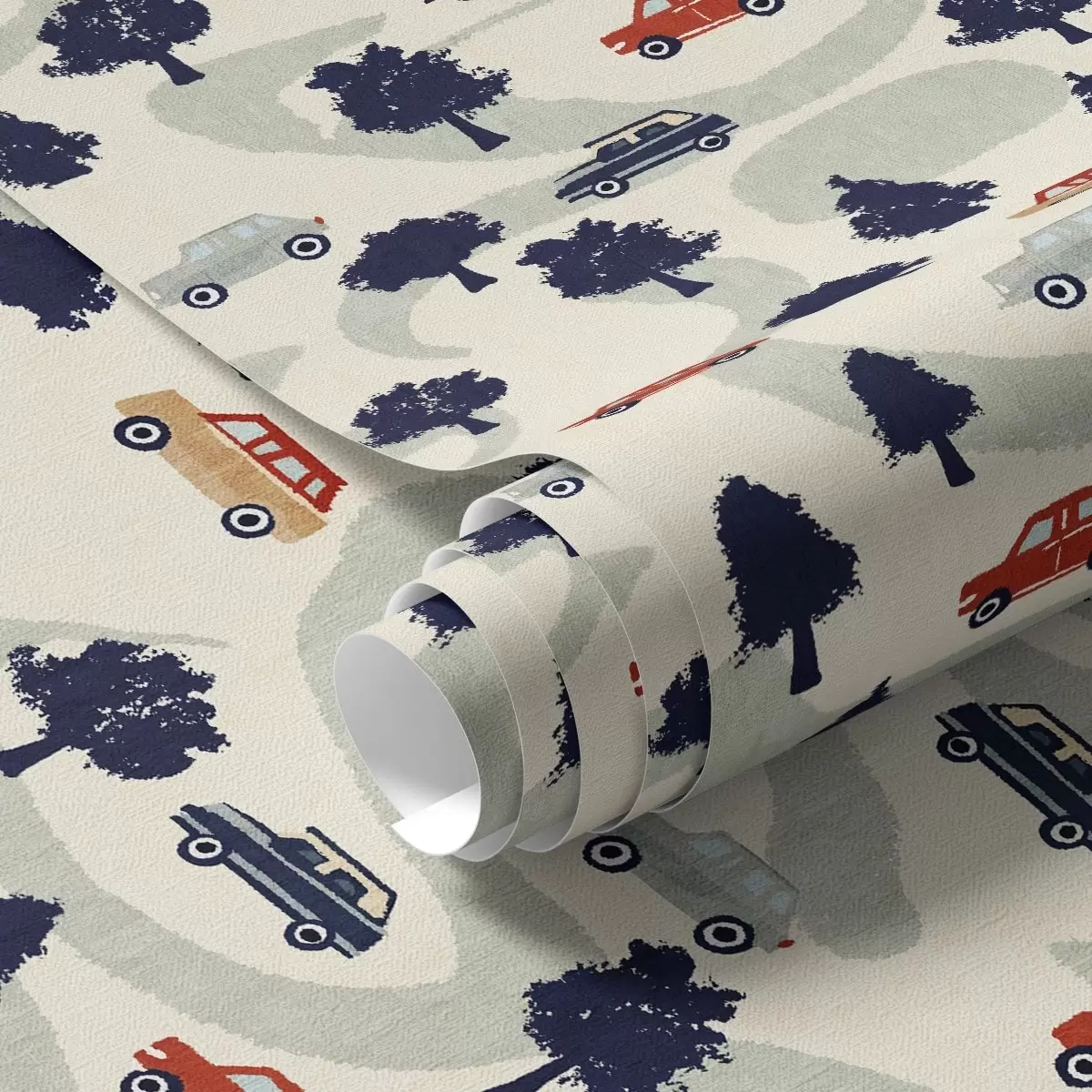 Papel pintado Divertidos coches entre los árboles sobre fondo crema Nr. a00119