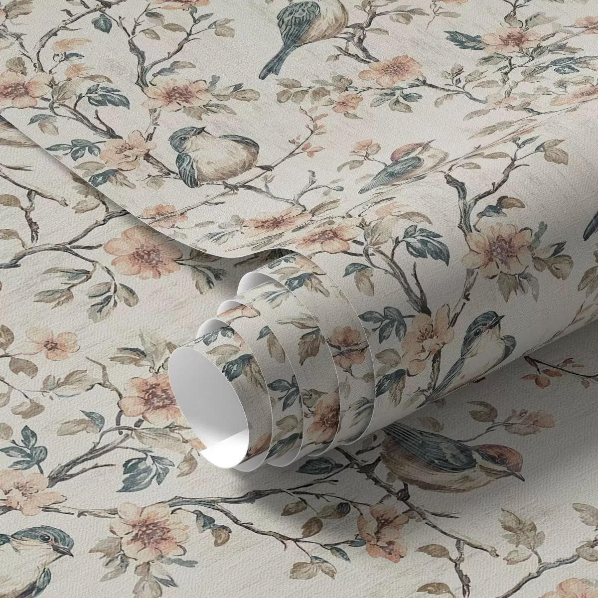 Papel pintado Pájaros sobre ramas con flores en estilo acuarela retro Nr. a00197