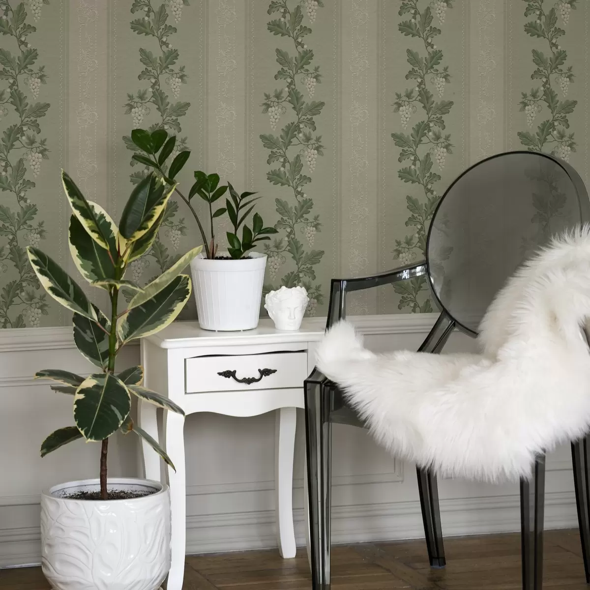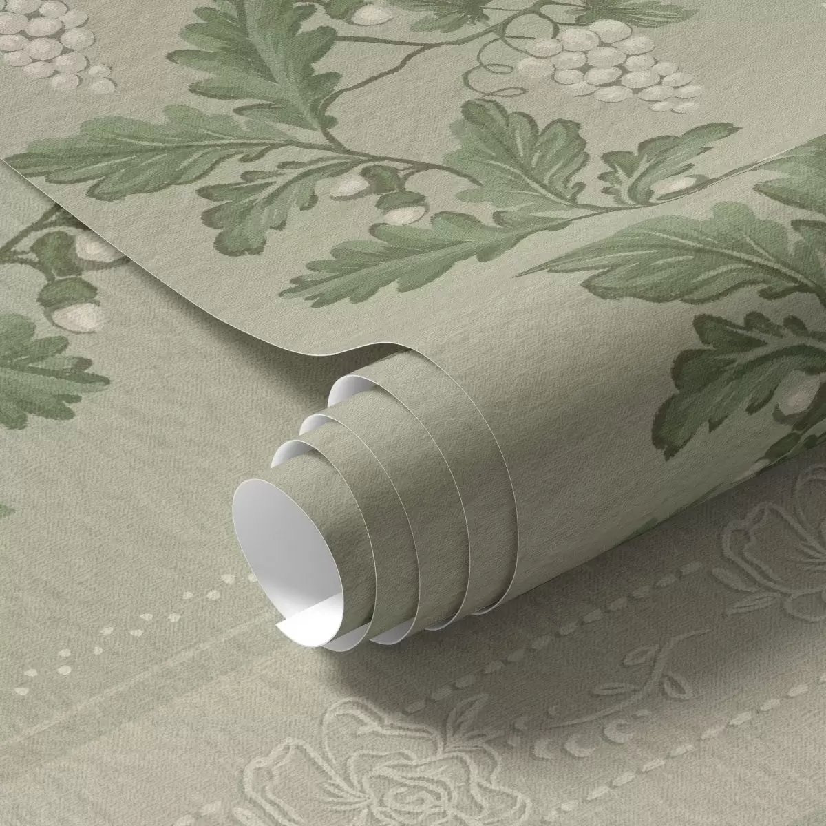 Papel pintado Racimos de uvas y encaje, patrón clásico verde Nr. a00223
