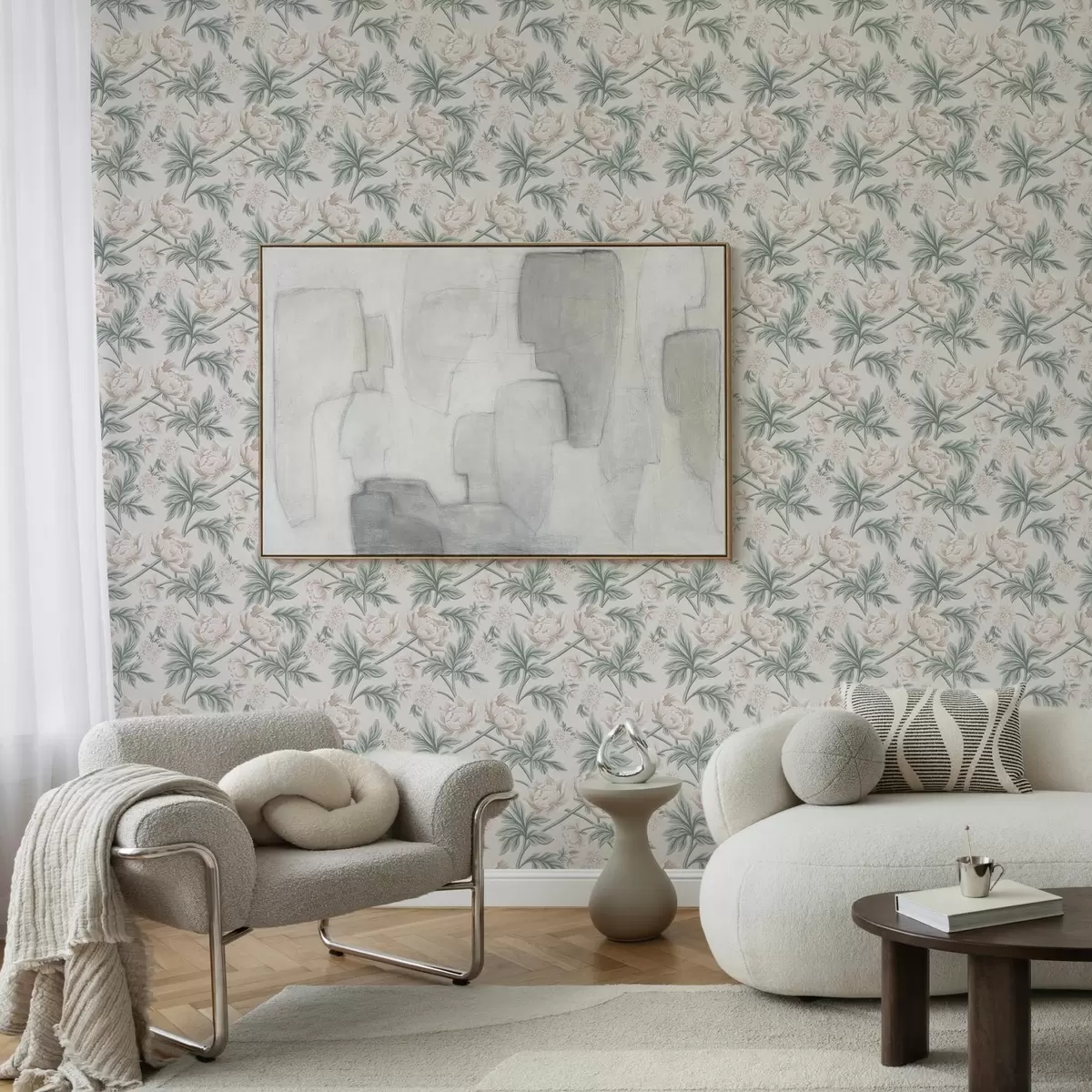 Papel pintado Exuberantes peonías en beige claro y verde beige y verde Nr. a00445