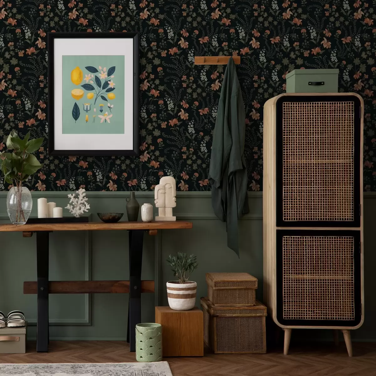 Papel pintado Lirios naranjas y pequeñas flores sobre fondo negro Nr. a00463