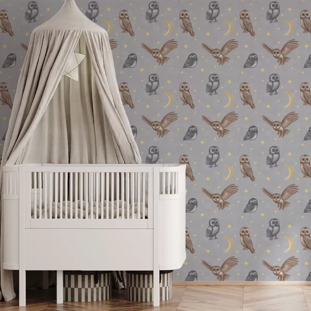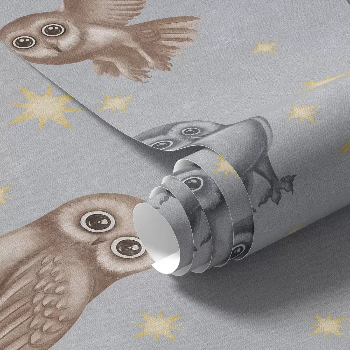 Papel pintado Búhos y estrellas sobre un fondo de cielo nocturno gris Nr. a00475