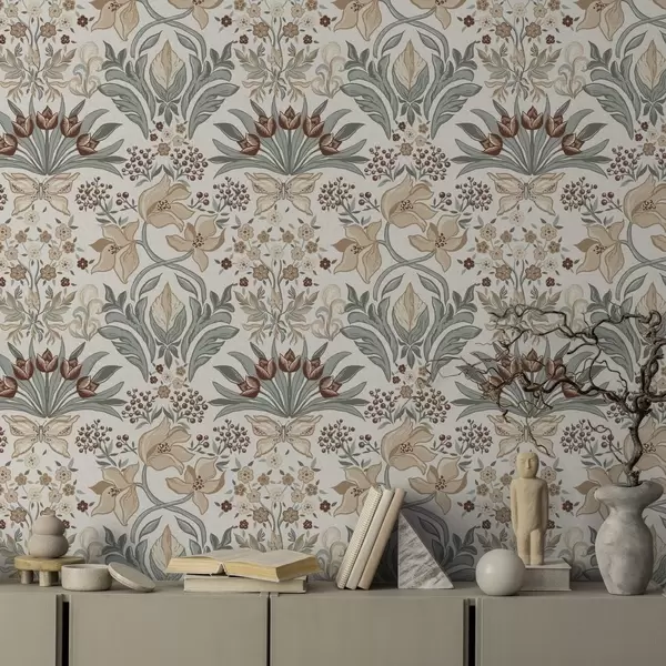 Papel pintado Lirios decorativos y una mariposa sobre fondo crema Nr. a00500
