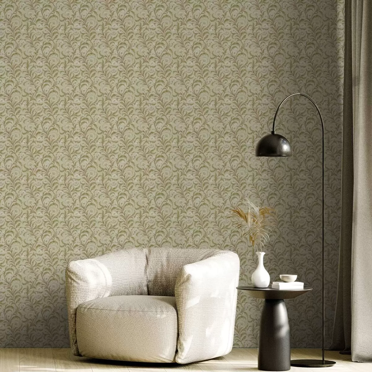 Papel pintado Adorno vintage con volutas y flores, beige y oliva Nr. a00574