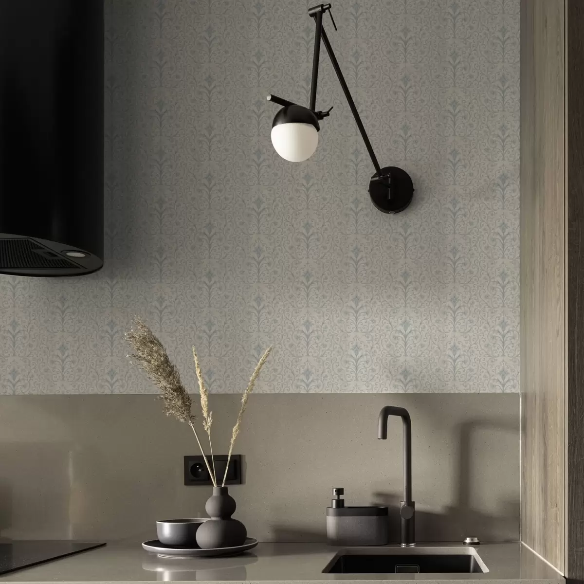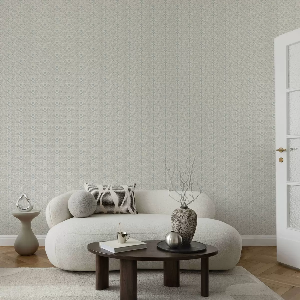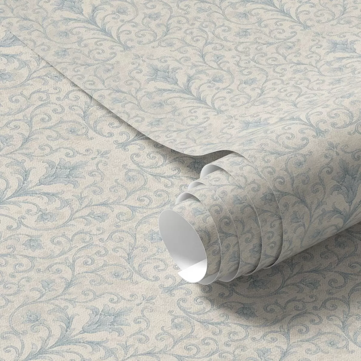 Papel pintado Damasco azul con volutas sobre fondo crema Nr. a00578