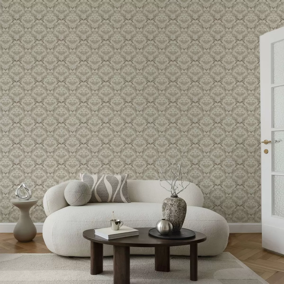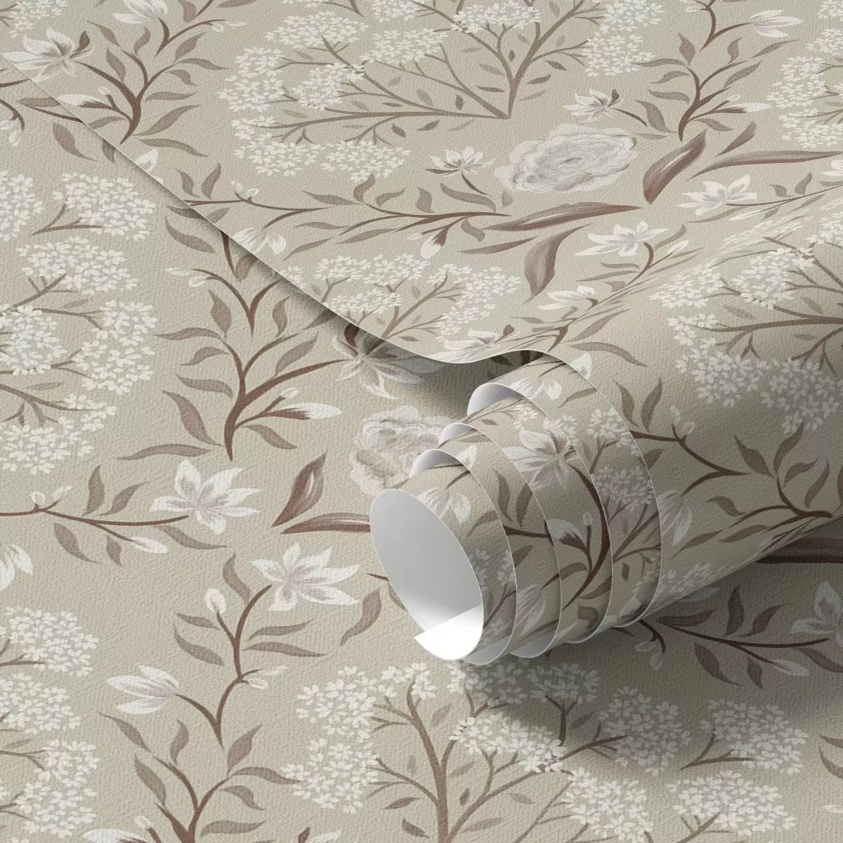 Papel pintado Damasco beige: peonías, campanillas de invierno y racimos de encaje Nr. a00603v1