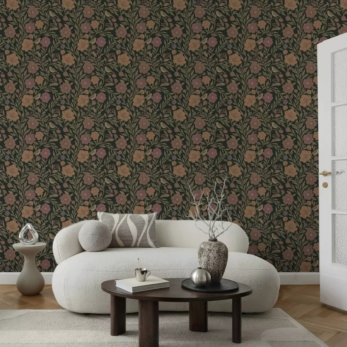 Papel pintado Flores otoñales y pájaros sobre un fondo esmeralda intenso Nr. a00605v1