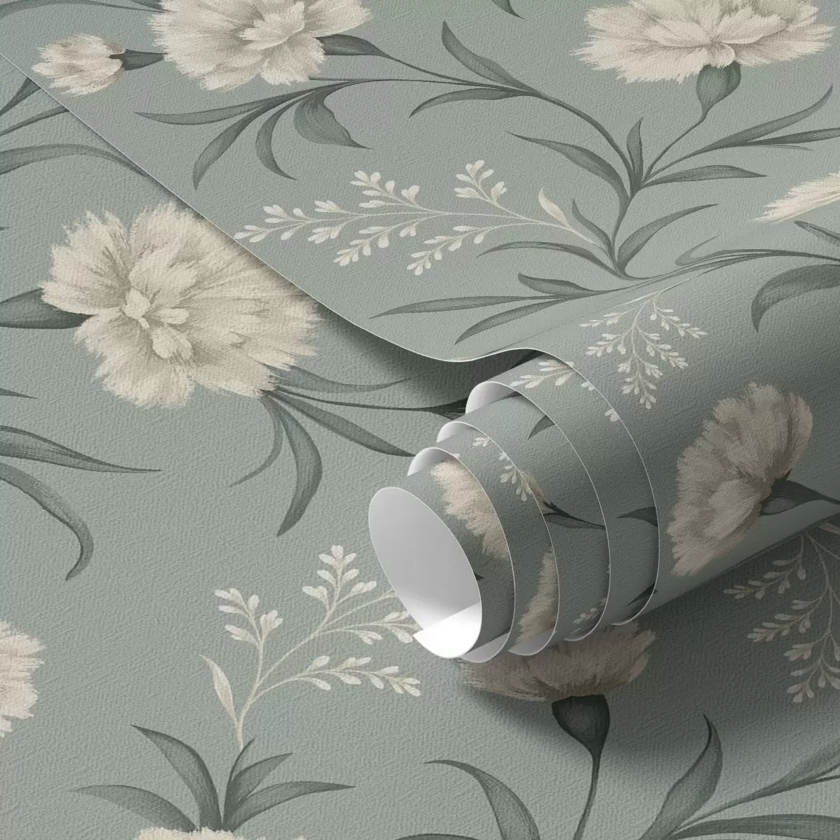 Papel pintado Claveles en polvo sobre fondo gris verdoso, estampado refinado Nr. a00610