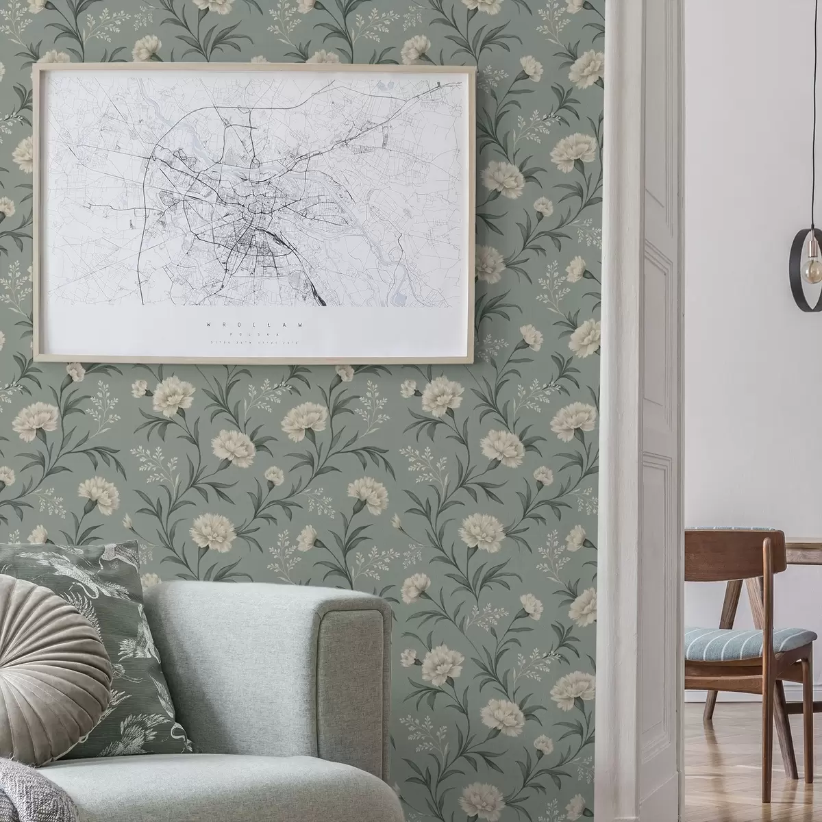 Papel pintado Claveles en polvo sobre fondo gris verdoso, estampado refinado Nr. a00610