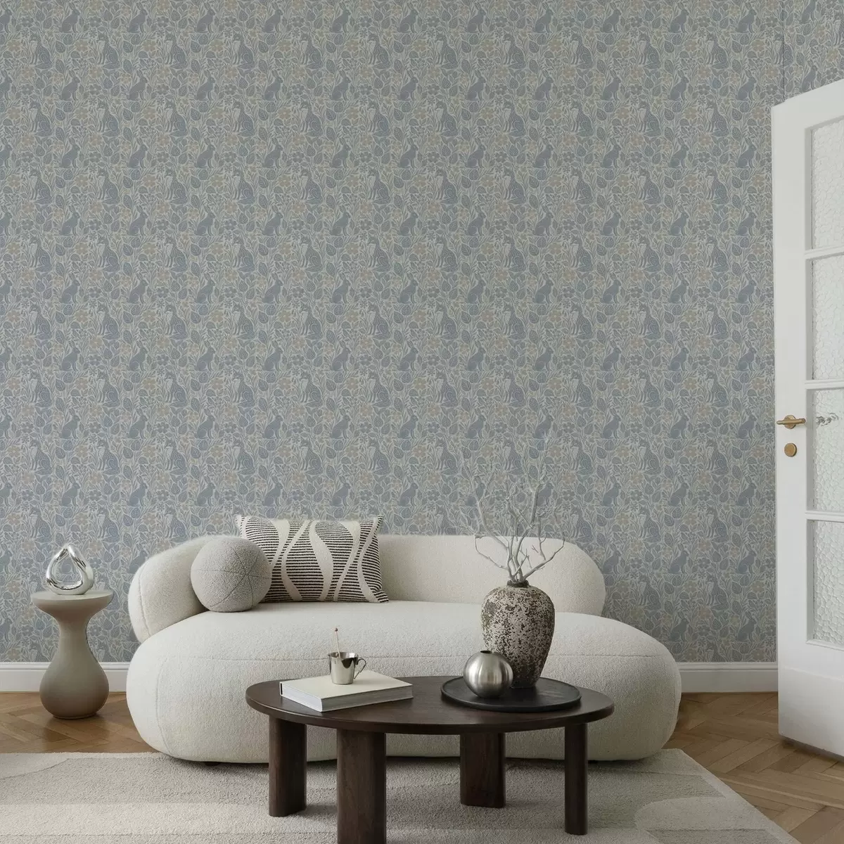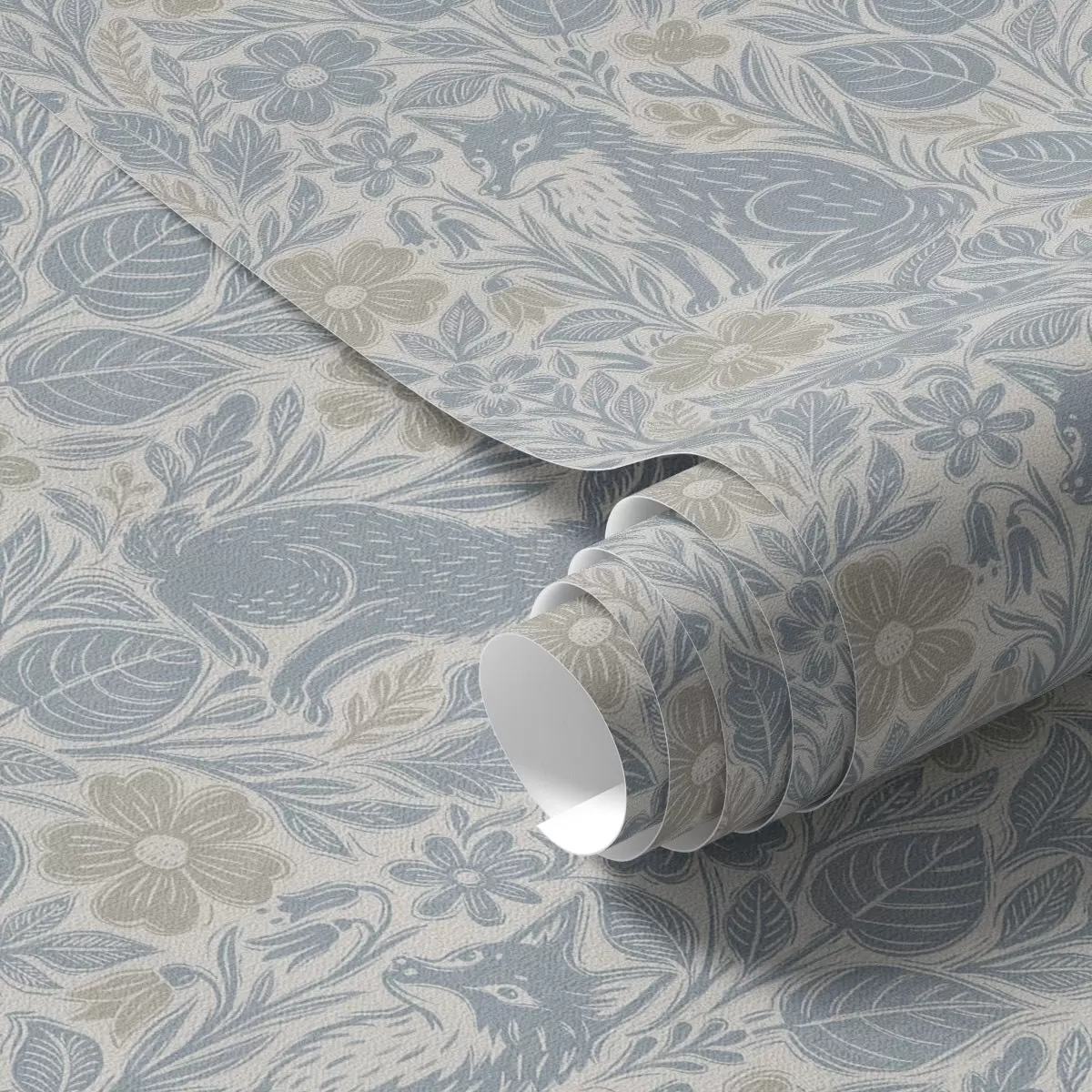 Papel pintado Animales y flores del bosque: zorro y liebre en tonos azules Nr. a00613