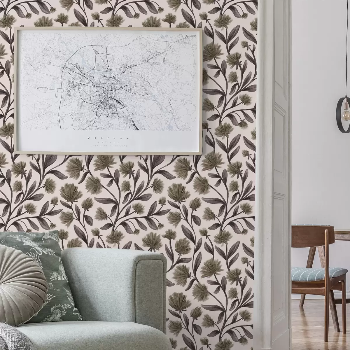 Papel pintado Flores silvestres en tonos gris oliva sobre fondo crema Nr. a00623v1