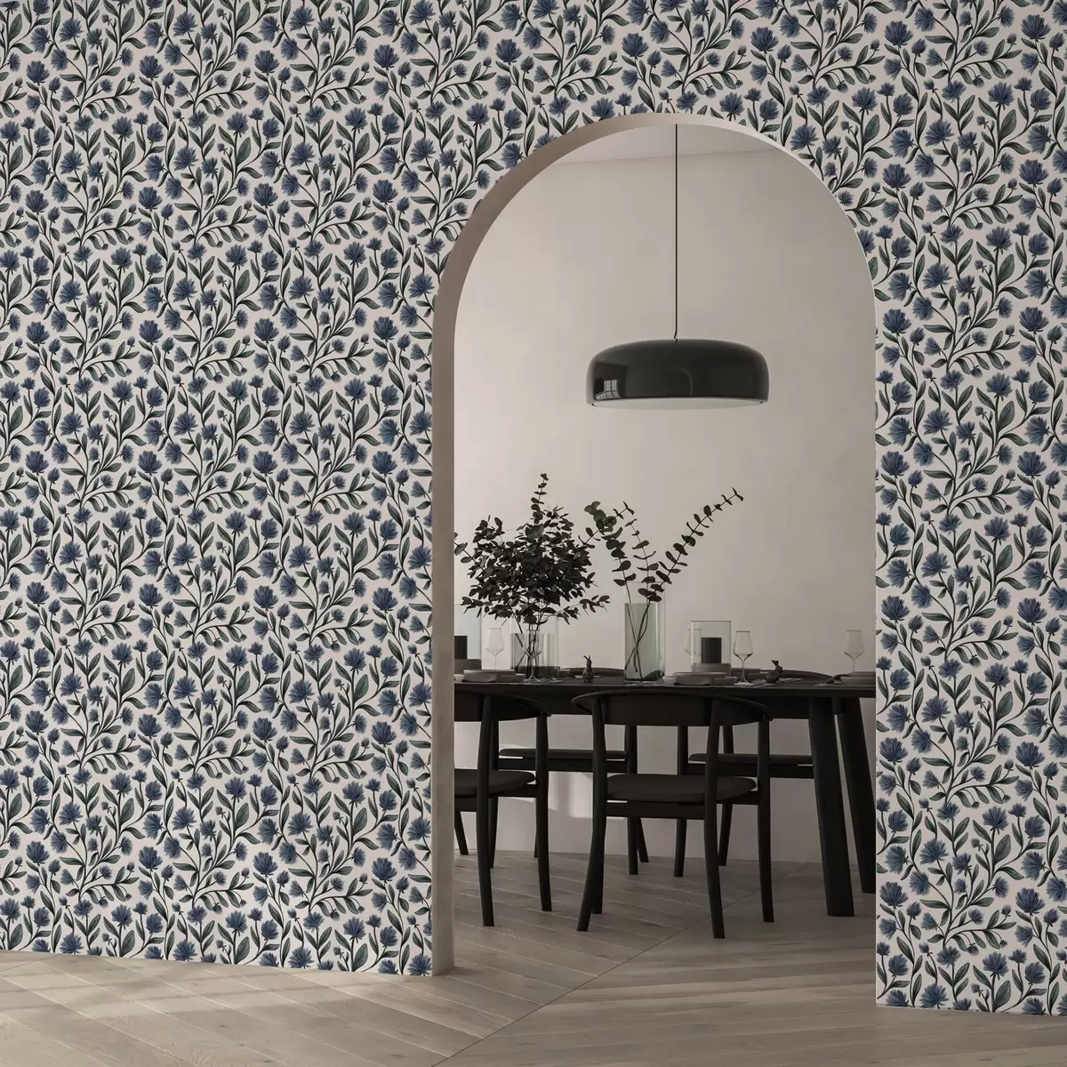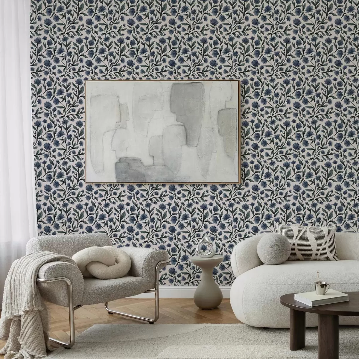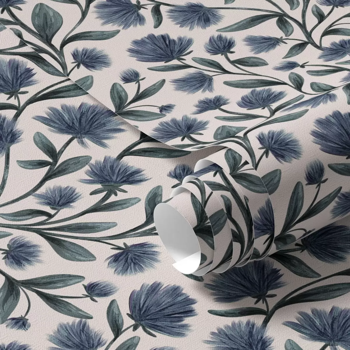 Papel pintado Flores silvestres en una paleta de colores azul verdosos sobre un fondo crema Nr. a00623v2