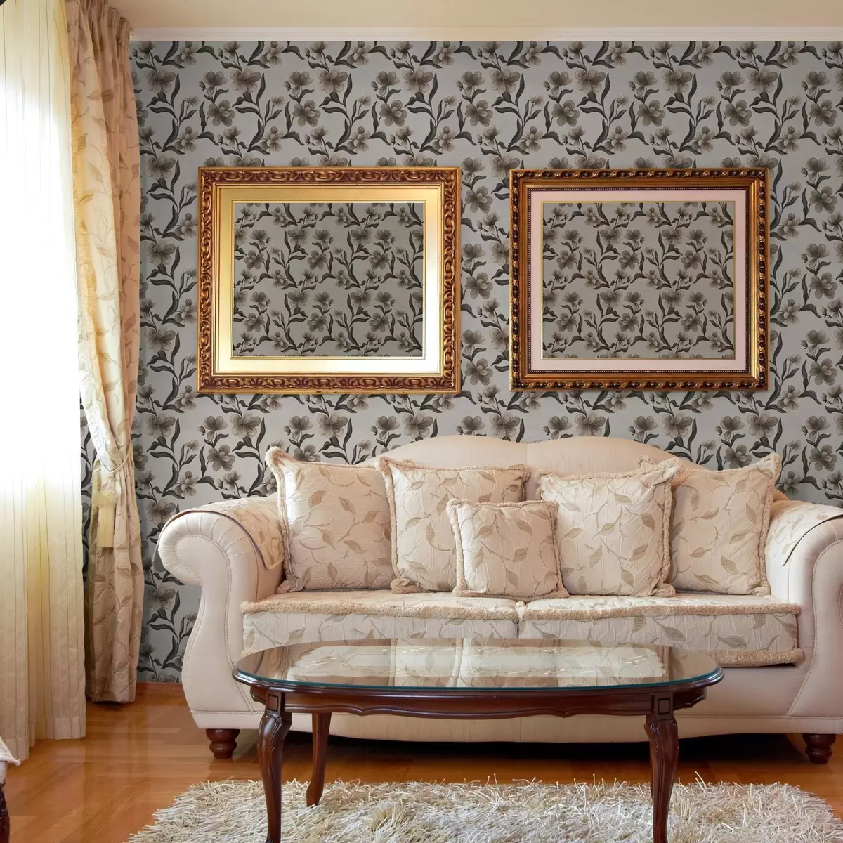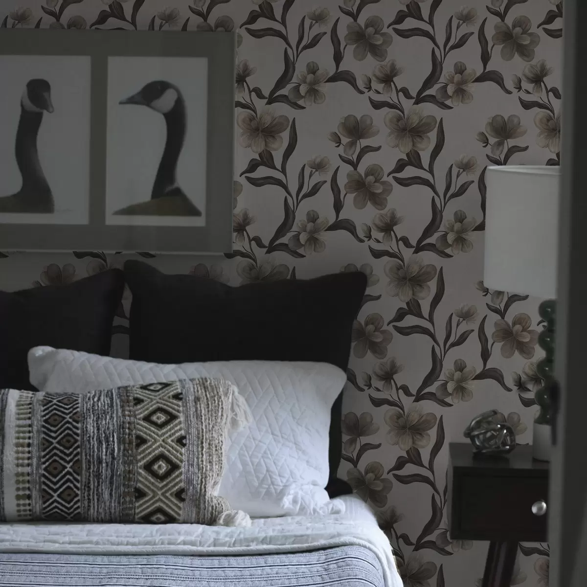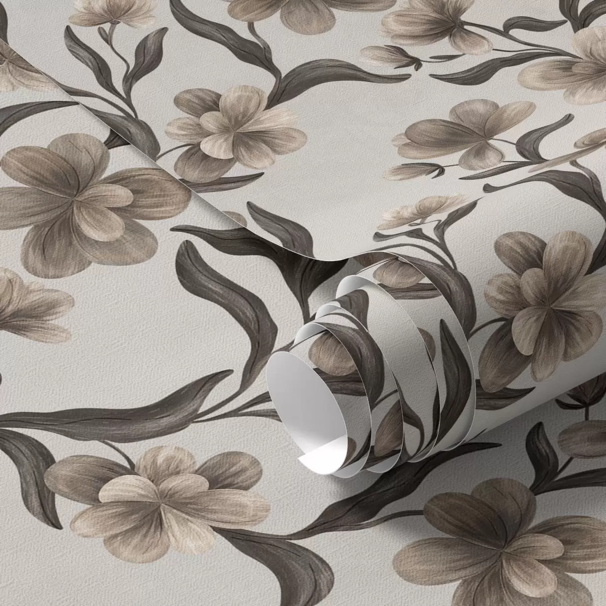 Papel pintado Flores beige y ramas oscuras sobre fondo gris claro Nr. a00626v1