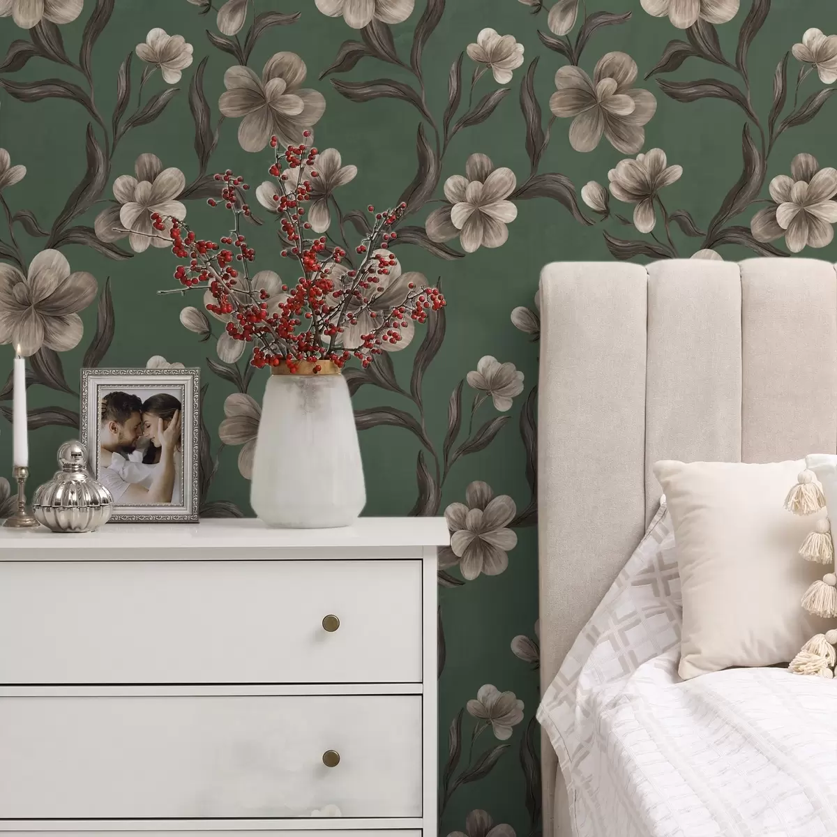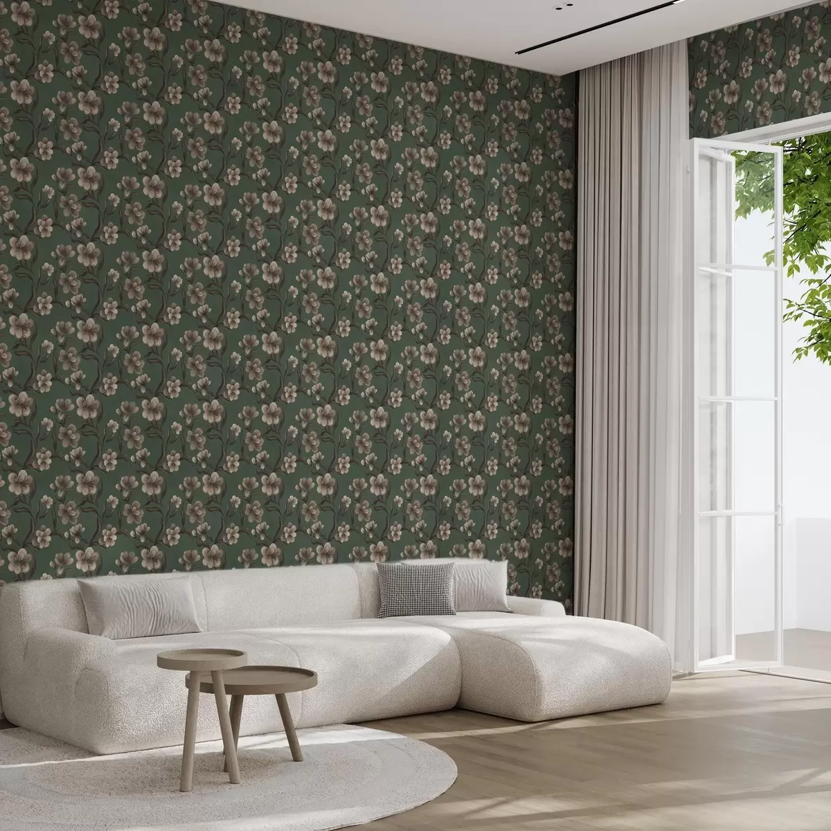 Papel pintado Flores beige sobre un fondo verde intenso Nr. a00626v3