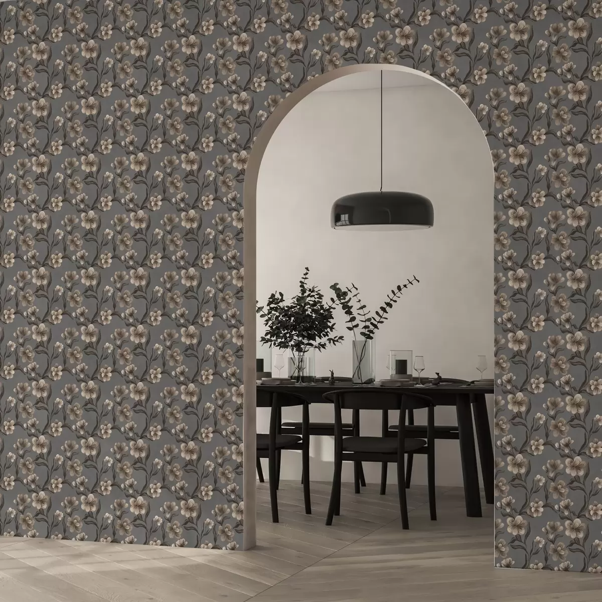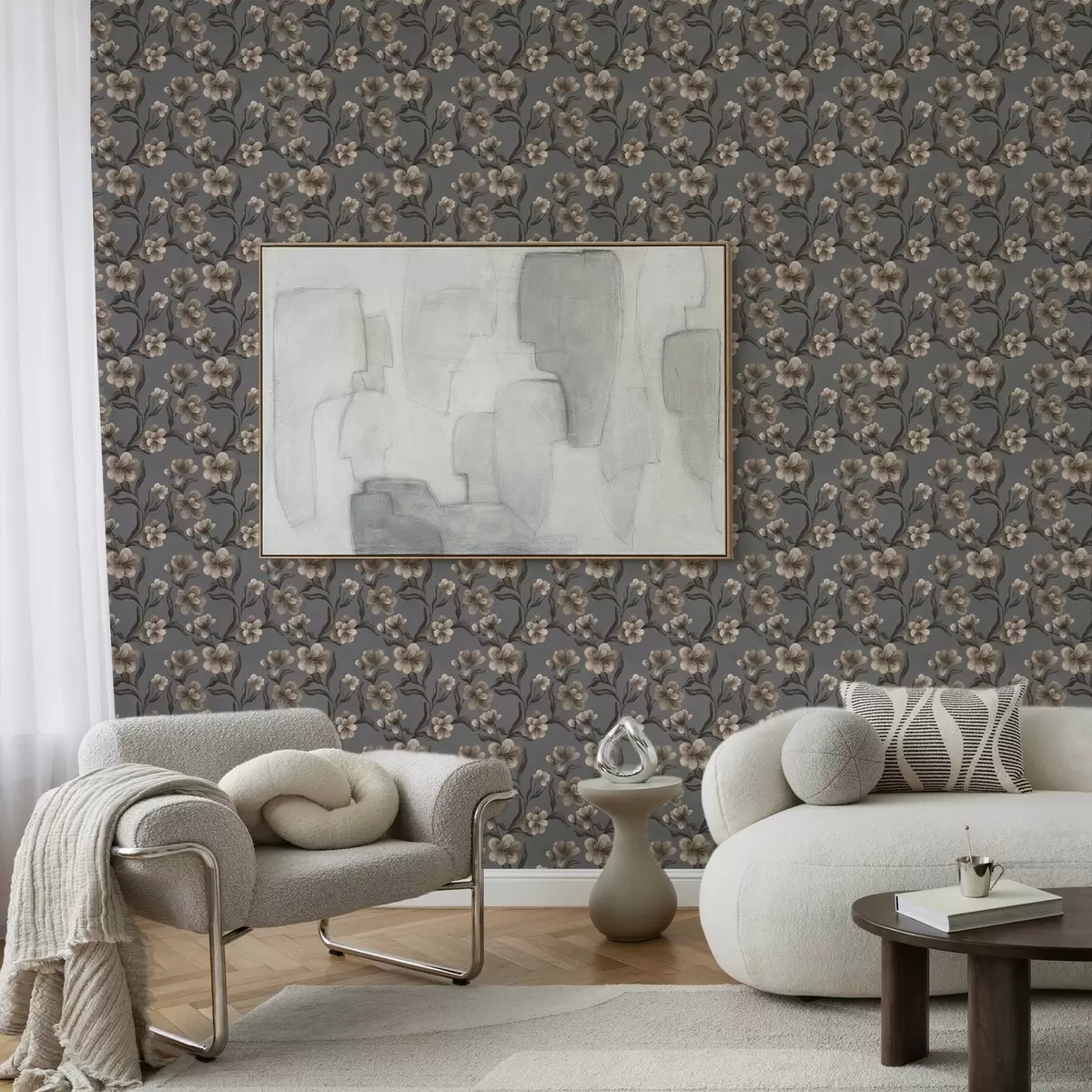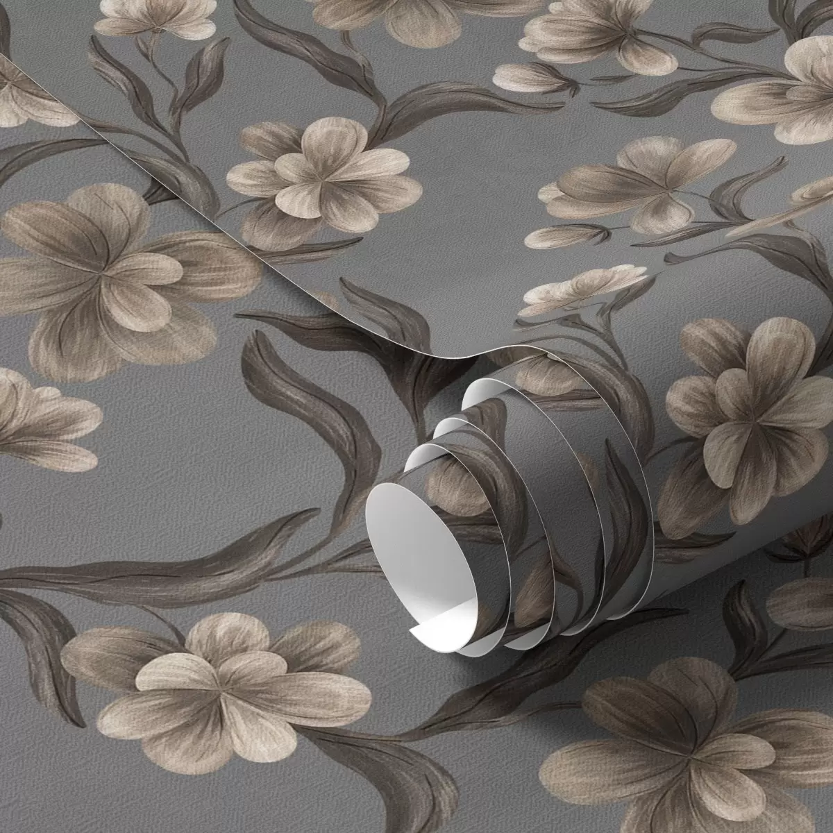 Papel pintado Flores beige sobre fondo gris grafito Nr. a00626v4