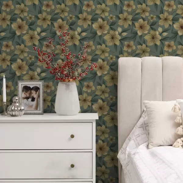 Papel pintado Flores ocres sobre fondo verde intenso, patrón denso Nr. a00628
