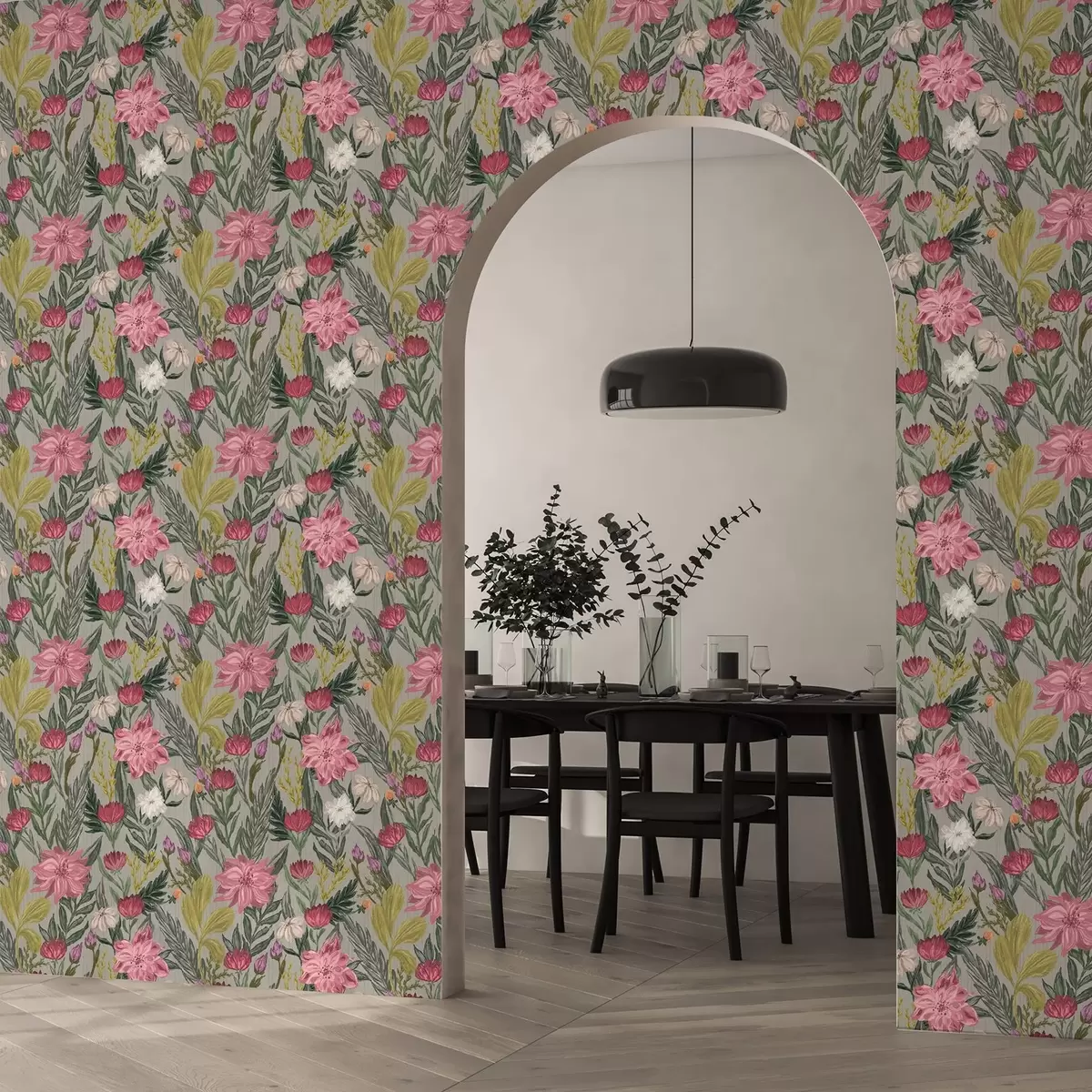 Papel pintado Exuberantes flores rosas y crema sobre fondo gris, textura impasto Nr. a00629