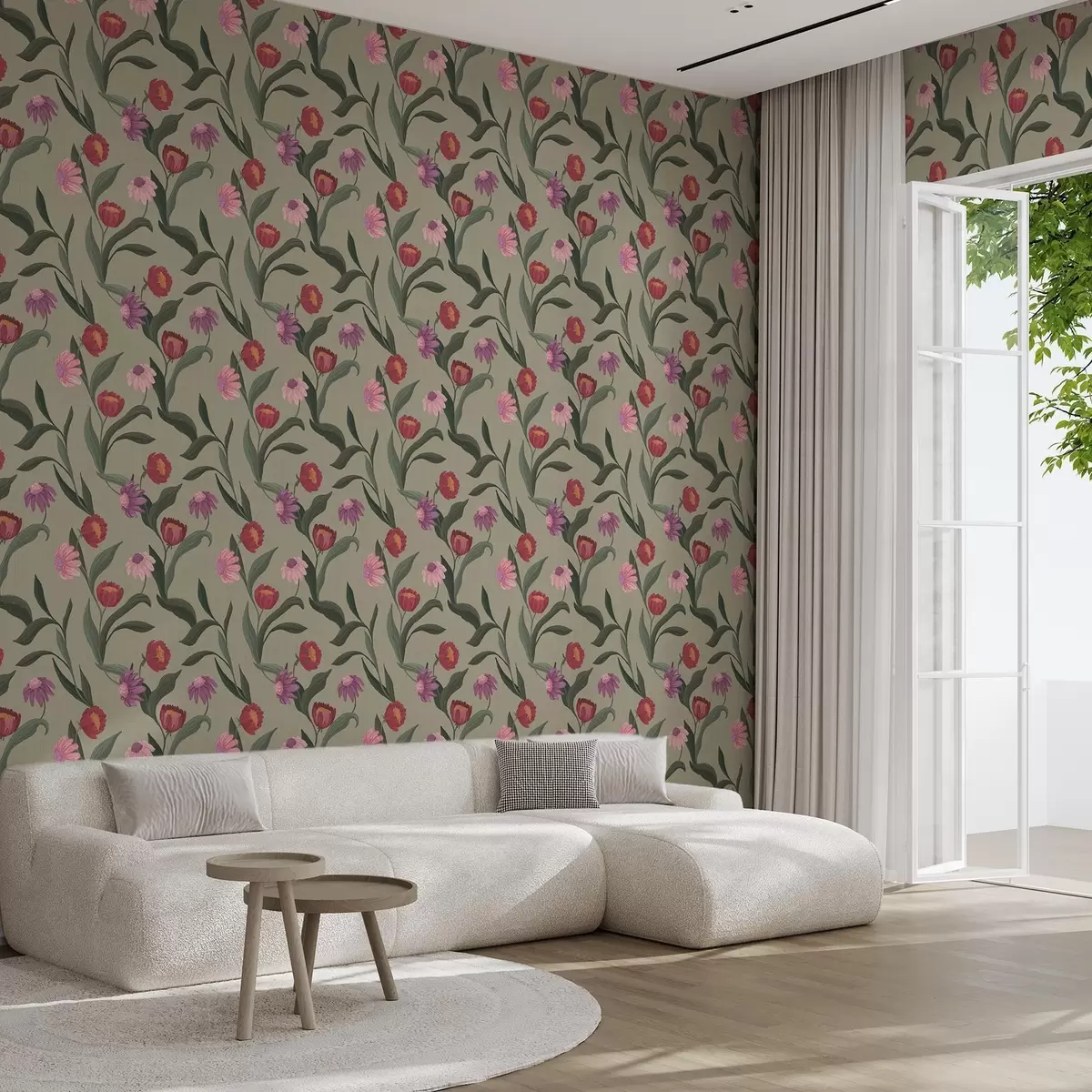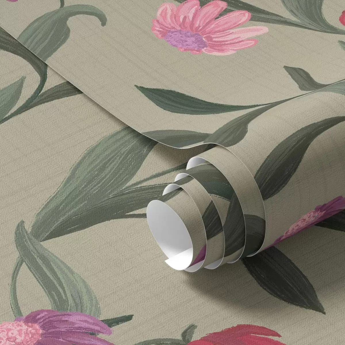 Papel pintado Flores de color rosa rojizo sobre fondo oliva, textura de lienzo Nr. a00631v1