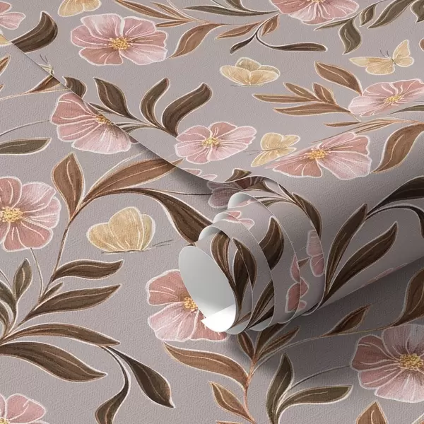 Papel pintado Flores rosas y mariposas sobre un fondo gris-beige Nr. a00633