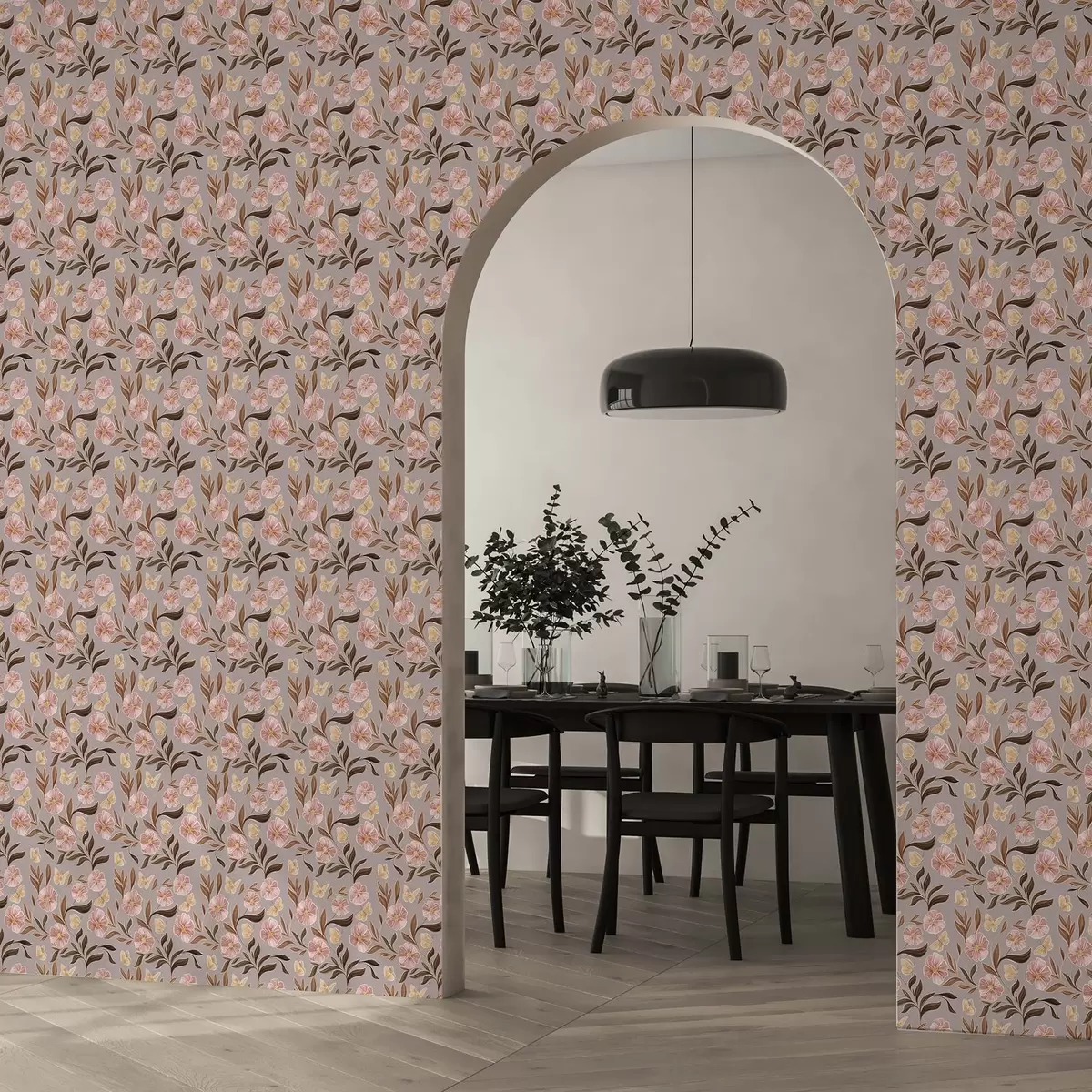 Papel pintado Flores rosas y mariposas sobre un fondo gris-beige Nr. a00633