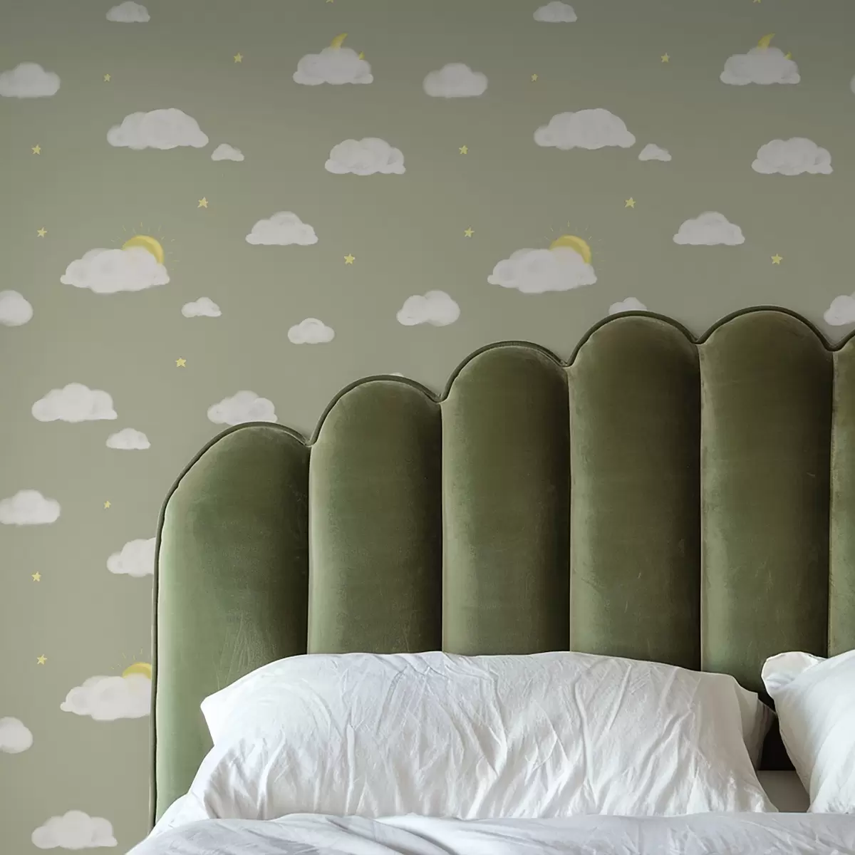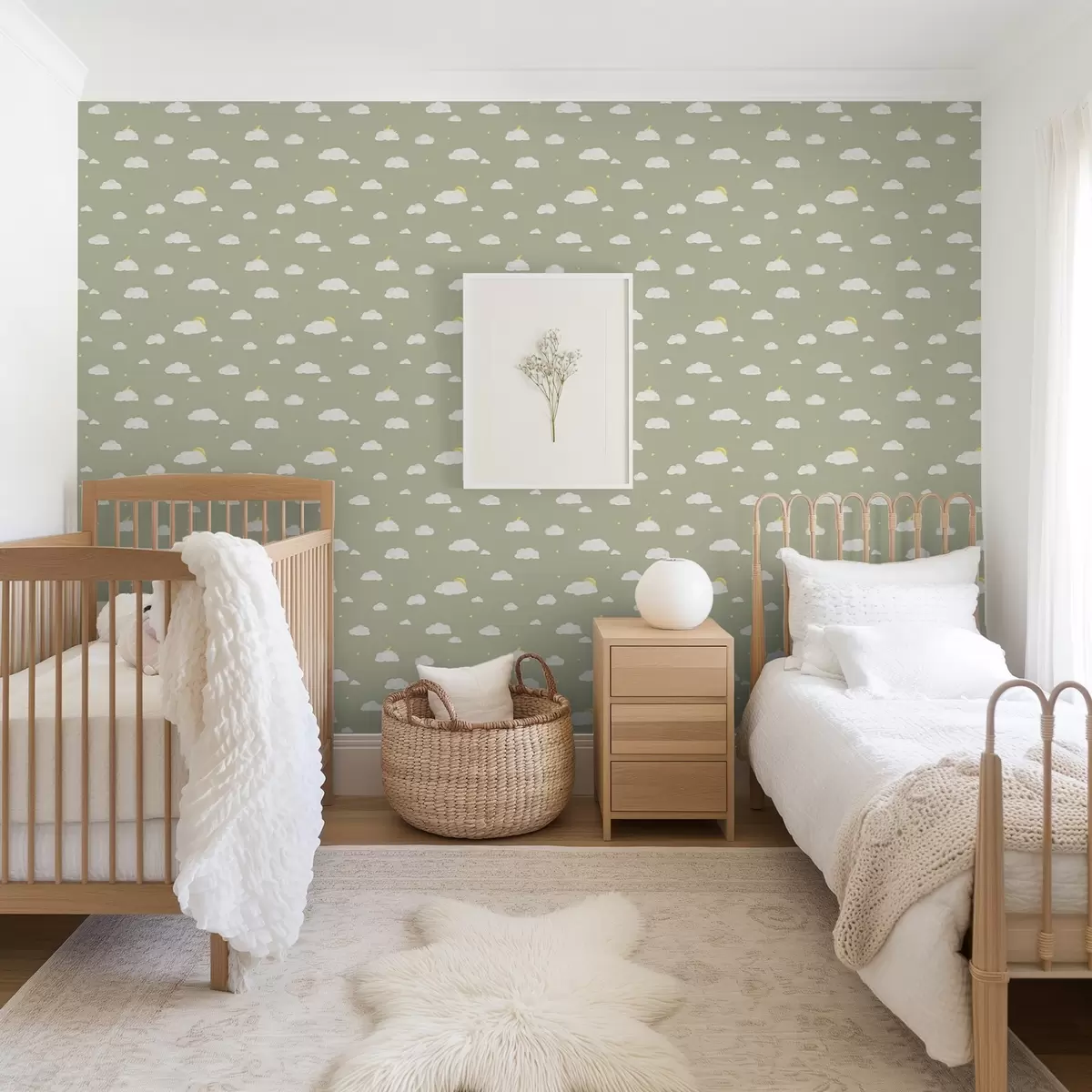 Papel pintado Nubes suaves, estrellas y sol sobre un fondo gris verdoso Nr. a00652v1