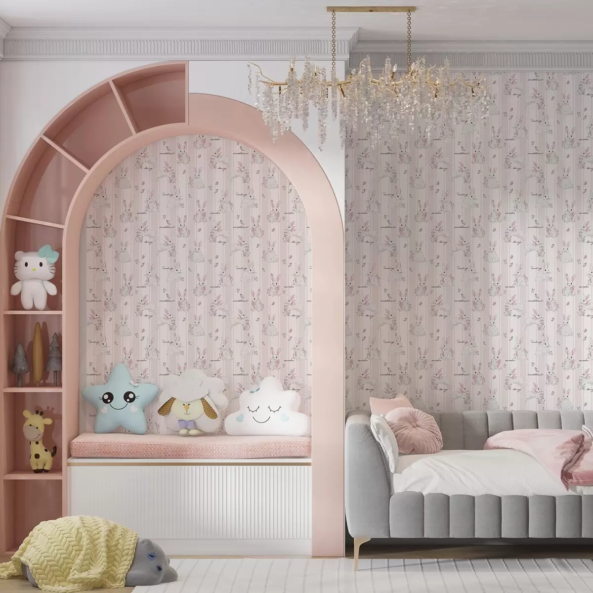 Papel pintado Conejitos con lazos, rayas rosas y pequeñas letras. Nr. a00657
