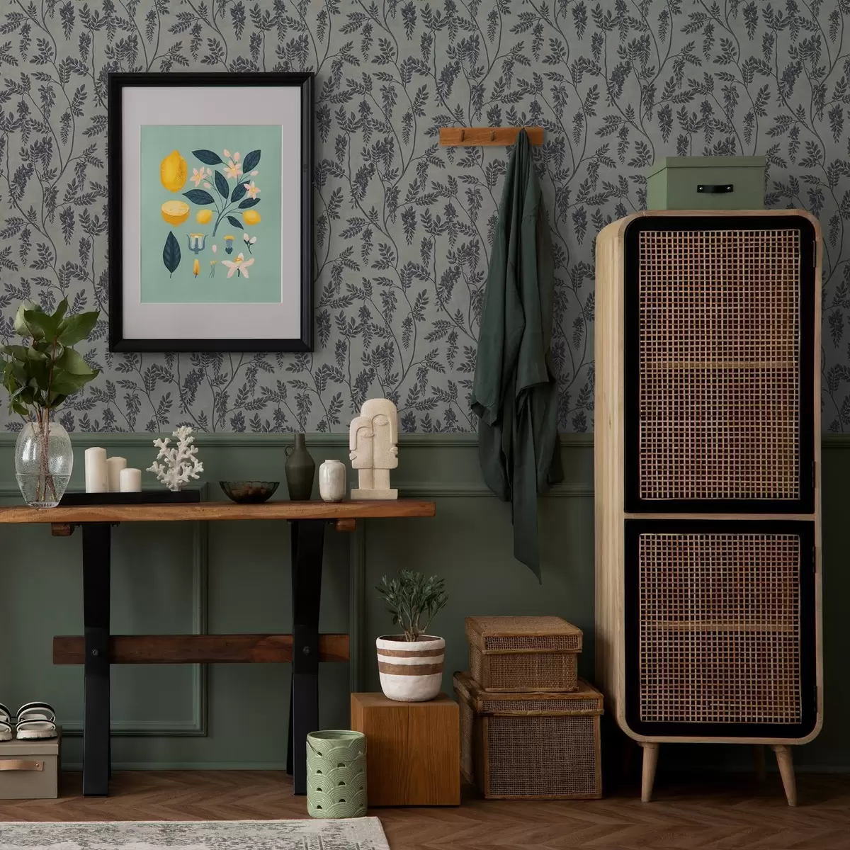 Papel pintado Ramas con flores oscuras sobre un fondo gris-beige Nr. a00672