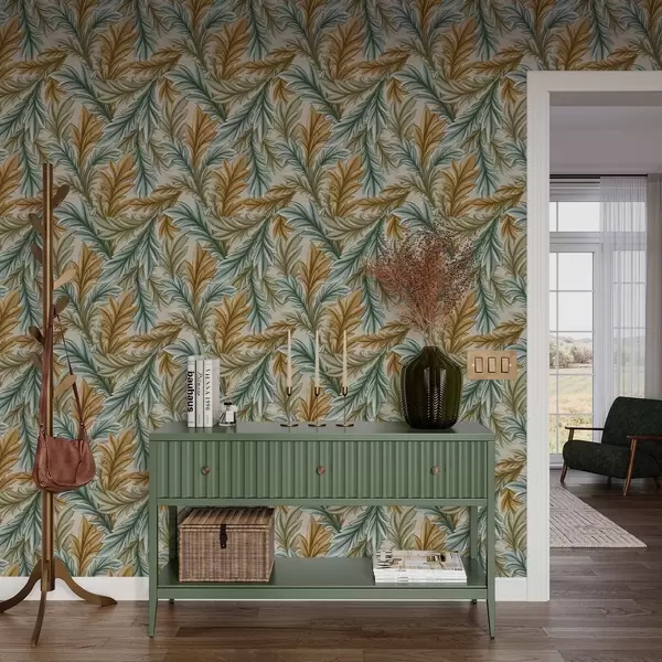 Papel pintado Follaje decorativo en una cálida paleta de colores ocres y verdes Nr. a00673