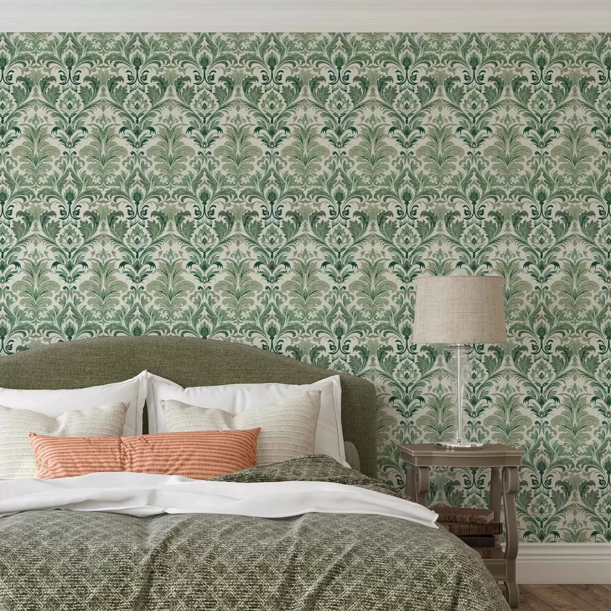 Papel pintado Damasco verde con textura en relieve sobre fondo claro Nr. a00692