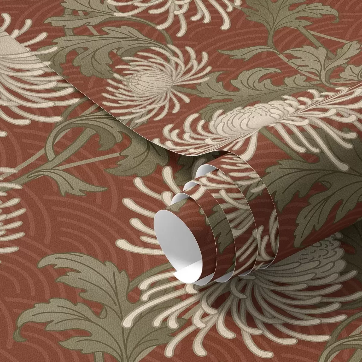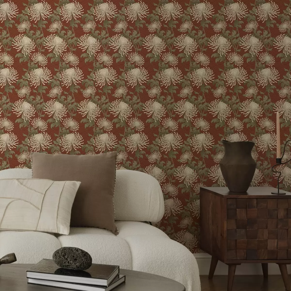 Papel pintado Crisantemos color crema sobre fondo terracota, estilo asiático Nr. a00693